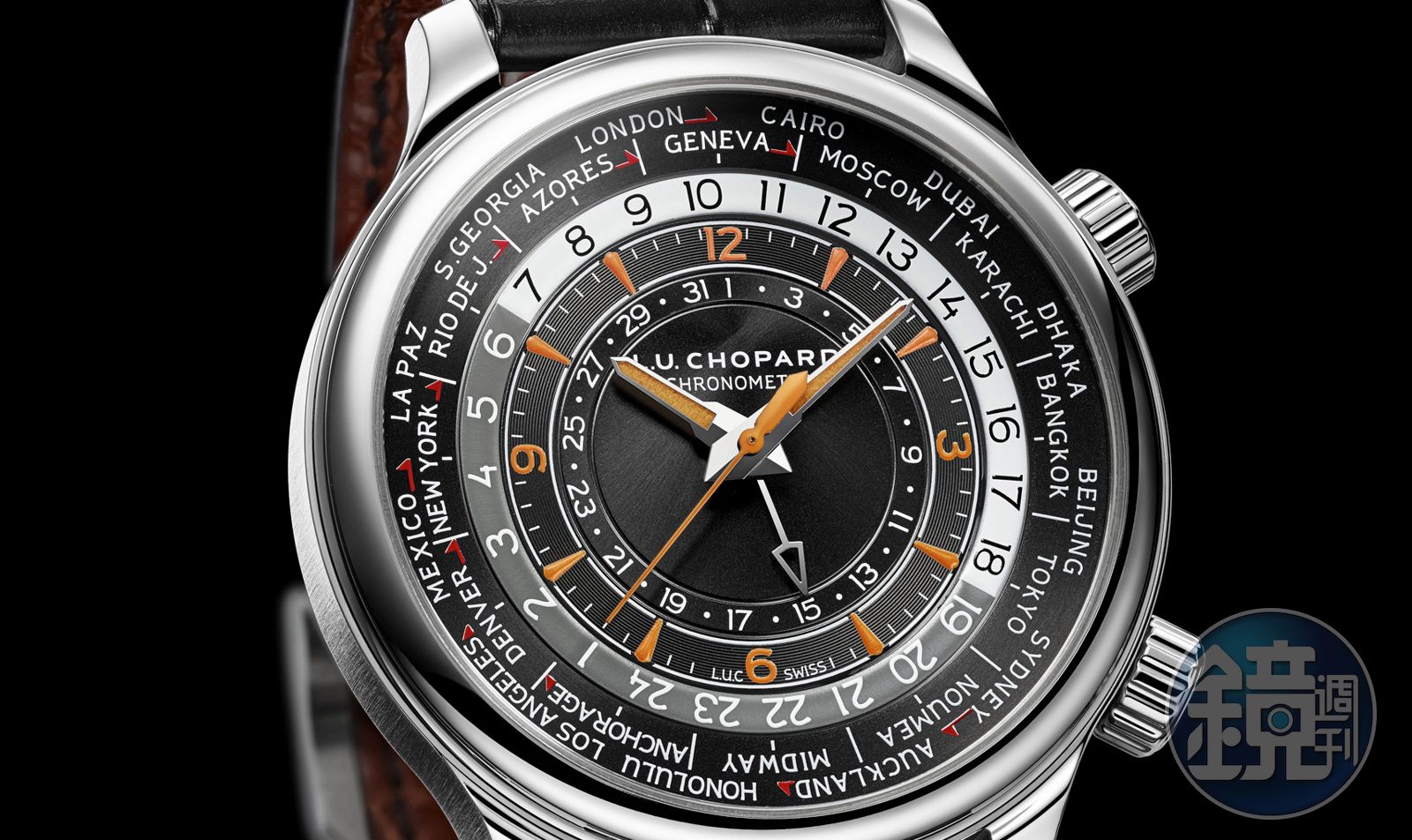 郭:其實這款錶有個大家會忽略的地方。沒錯,它的世界時間功能就是最常見的作法:外圈是時區城市名稱,內圈是對應的24小時刻度盤,這樣子的設計來自Louis Cottier在1935年的發明,至今像是PP、VC,都是用這樣的配置方式。不過這款錶多了日期顯示功能,以往世界時間很少搭配日期(很難再把日期窗放到縝密的面盤上),蕭邦這款作品將日期改用指針方式指示,維持判讀的辨識度之外,四針同軸的作法也展現了品牌的製錶功力。