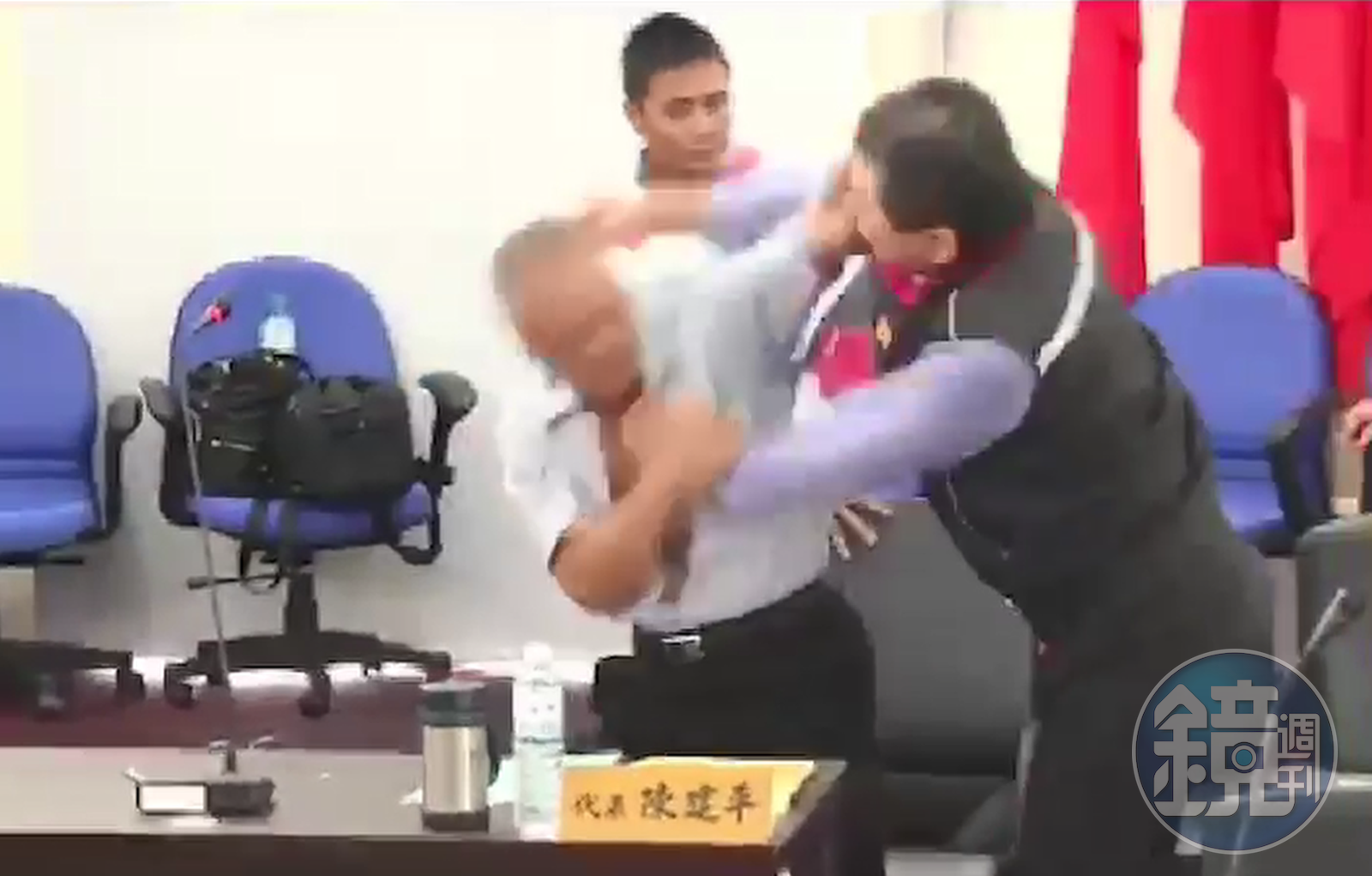 只是,陳建平表示自己是被動挨打,且「鄉代主席還補了一腳」;而鄭文仁則說自己是「心急,趨前急著解釋並出手推他,未打人」。當時,攝影紀錄的影片無法提供,如今畫面卻突然出現。雖無法看出誰先動手,但明顯可見到鄉代陳建平衝向鄉長鄭文仁後臉部結實挨拳,上衣也被撕開,陳則對鄭勒頸近身擊臉反擊,隨後雙雙掛彩倒地扭打,而此時身著黃色背心的鄉代會主席何富祥趁此上前補了一腿,接著趕上的鄉公所課長們才將2人分開。