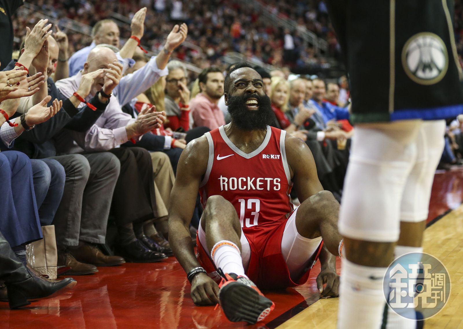 安戴托昆波在一次傳球時,竟勾射直接命中哈登頭部,讓他當場跌坐在地。(翻攝自Milwaukee Bucks推特)發布時間:2019.01.10 17:00 臺北時間