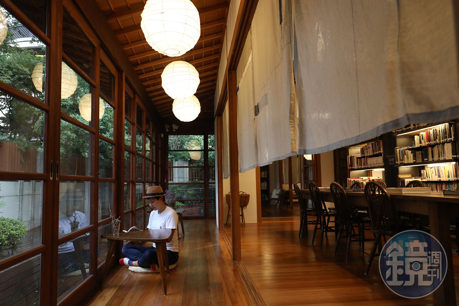 老屋內最熱門的閱讀座位是兩張對著窗景的古董皮沙發,一屁股坐下去,舒適的角度讓人不自覺慵懶起來。文房目前蒐羅了四千多本書籍,挑選自己喜歡的主題,不論是繼續窩在沙發裡,還是端坐大長桌前,又或者盤腿席地而坐,在老屋與書本相處是自由自在的。