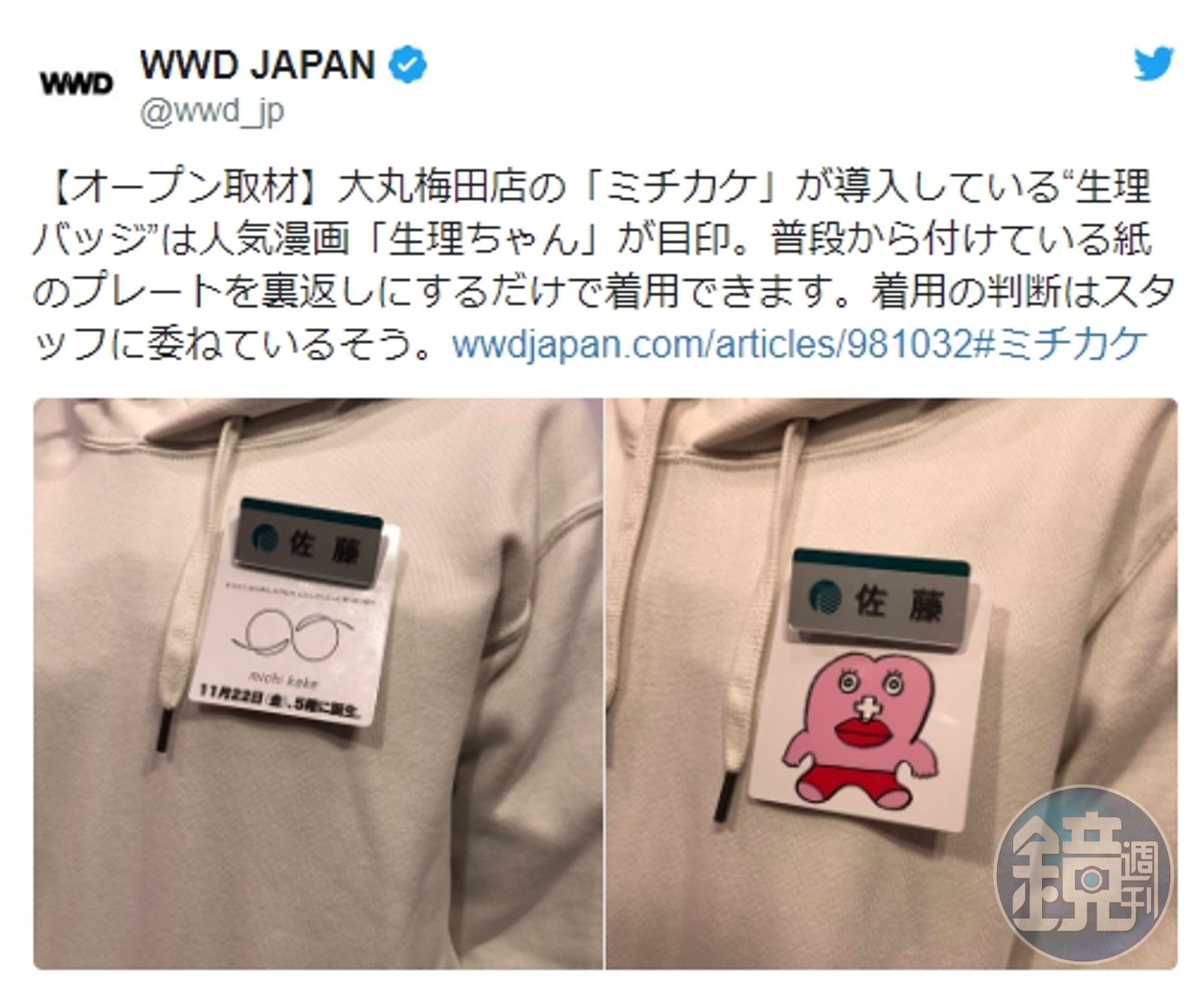 根據《News.com.au》報導,日本大阪梅田百貨於昨(28日)表示,本意是希望讓女性員工生理期配戴漫畫角色「月經醬」(Seiri Chan)的圖章,以鼓勵同事間發揮同理心。該圖章只須要轉動原本員工配戴的胸章紙盤,就可以替換為「月經醬」,是否換成月經醬的決定權在員工手上。