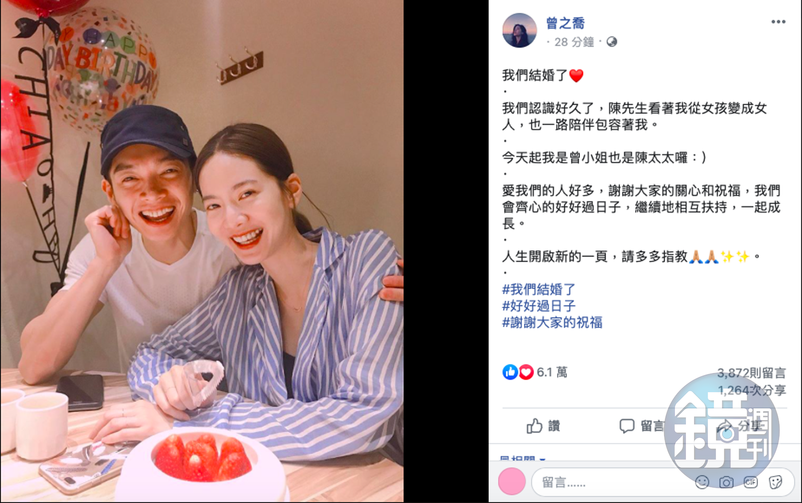 曾經透露「對結婚沒規劃」的曾之喬,今天中午在臉書PO出文字「我們結婚了。我們認識好久了,陳先生看著我從女孩變成女人,也一路陪伴包容著我。今天起我是曾小姐也是陳太太囉!愛我們的人好多,謝謝大家的關心和祝福,我們會齊心的好好過日子,繼續地相互扶持,一起成長。人生開啟新的一頁,請多多指教。」文末並hashtag「我們結婚了」。