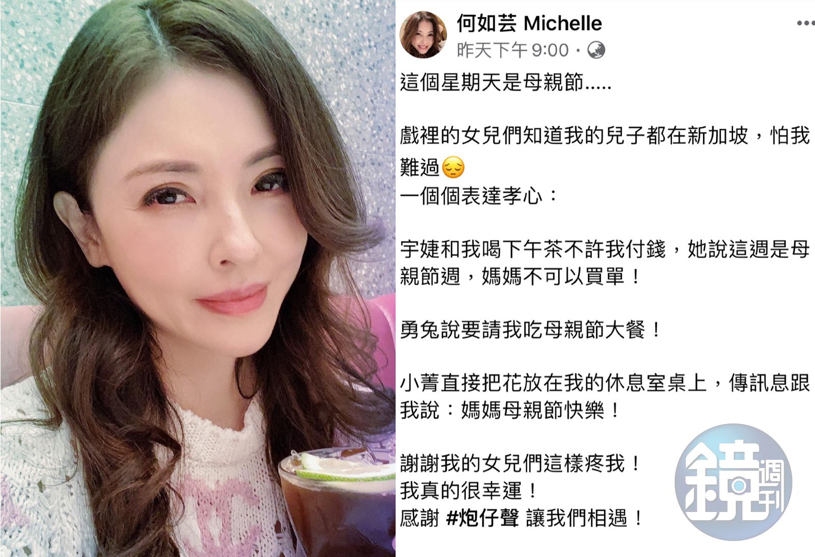 昨晚何如芸就在臉書透露「這個星期天是母親節⋯戲裡的女兒們知道我的兒子都在新加坡,怕我難過一個個表達孝心。」她表示女星王宇婕請她喝下午茶並暖心的說:「這週是母親節週,媽媽不可以買單!」劇中女兒勇兔則表示要請她吃母親節大餐!「無緣的媳婦」陳小菁則直接把花放在她的休息室桌上,傳訊息跟說:「媽媽母親節快樂!」這樣的暖心之舉讓她相當感動,「謝謝我的女兒們這樣疼我!我真的很幸運!」