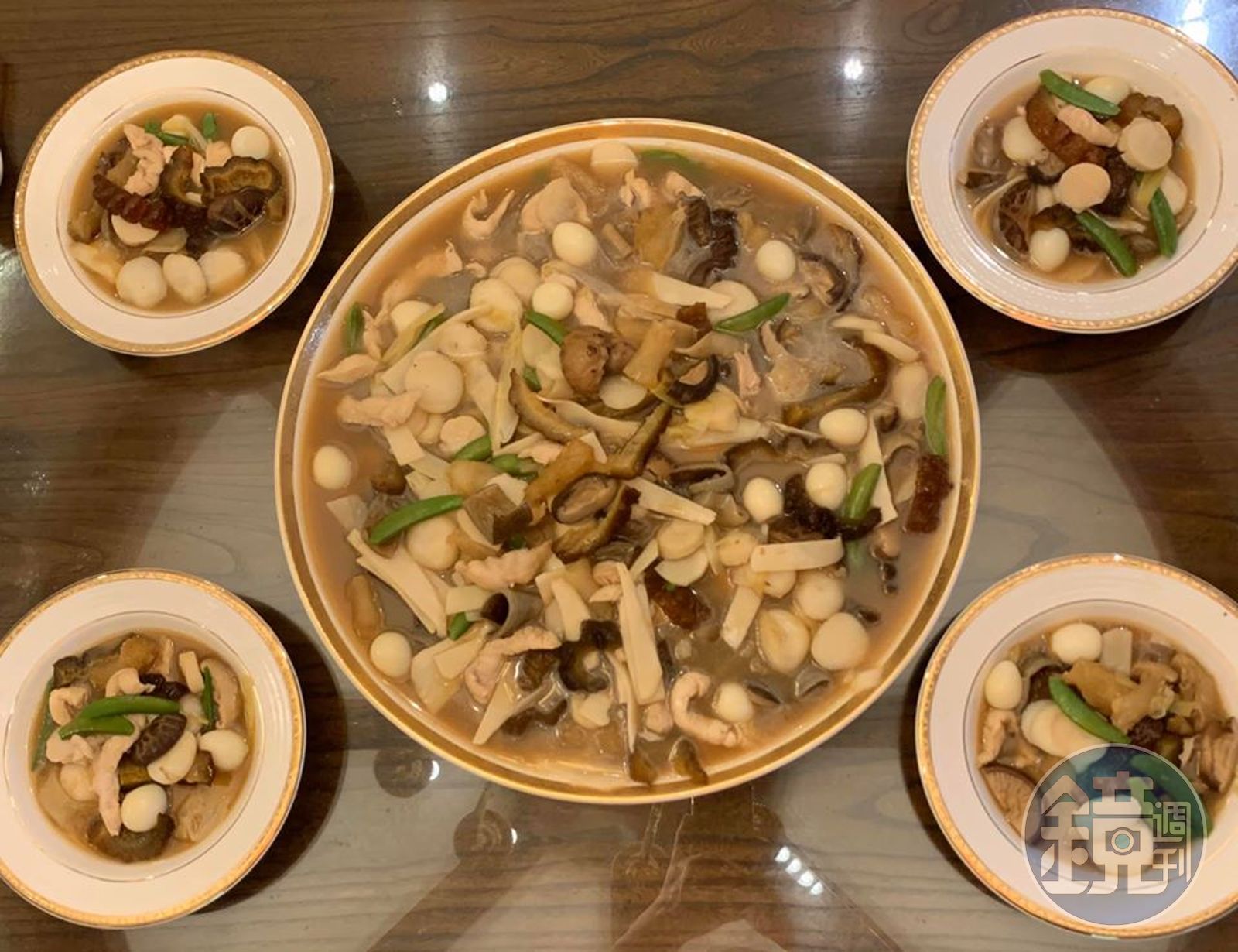 我家的燴海參,和葱燒烏參、蹄筋海參系出魯菜同門,但我爸爸設計這個菜是放在主菜後、雞湯前的出菜節奏。他認為原來的葱燒烏參,口味太濃稠,應該鮮美清淡一些,因此在葱燒海參、蹄筋入味後,加入高湯,燴入鯊魚皮(取其膠質,湯頭滑潤)、雞片、鵪鶉蛋、白菜心、筍片、香菇、茡薺,讓口感兼顧滑、嫩、脆,白菜心、筍片、香菇的加入,提供了蔬菜對海鮮的拉提作用。