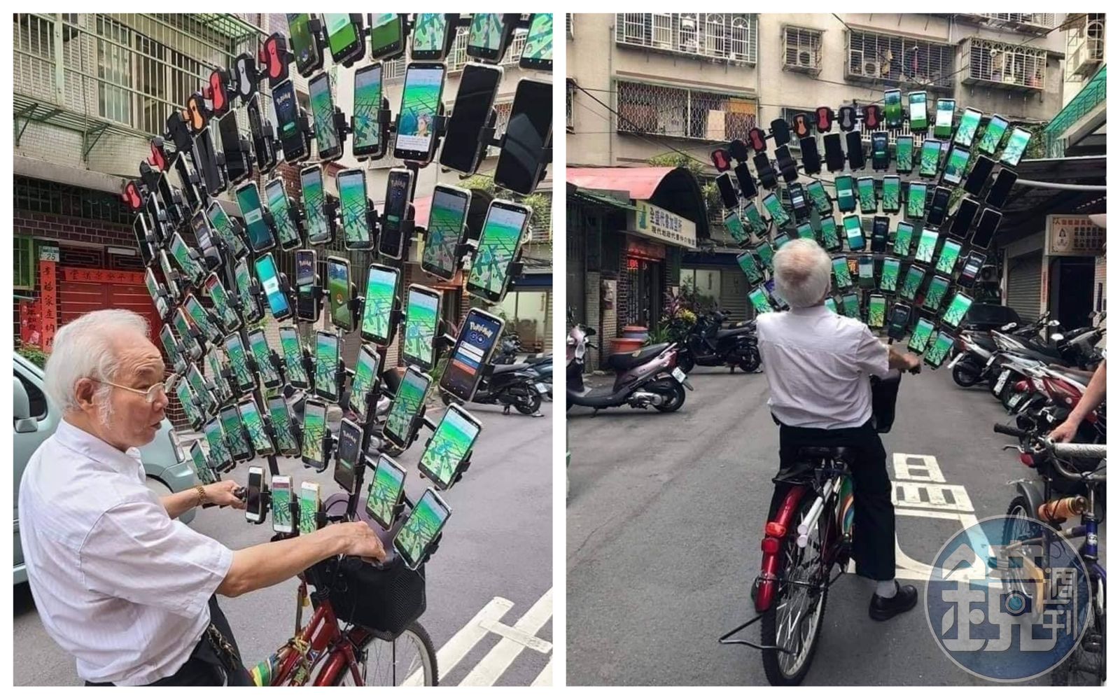 以騎腳踏車、多機抓寶爆紅的土城「寶可夢阿伯」陳三元,近日抓寶手機數量再進化。有網友在臉書社團分享,在路上看到寶可夢阿伯以64支手機抓寶,宛如「孔雀開屏」。