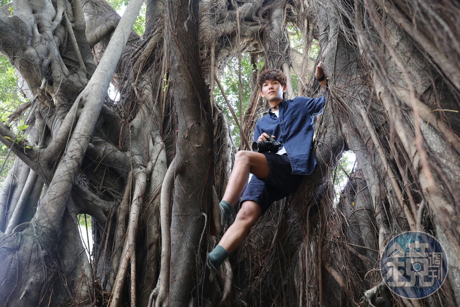 但採訪前拍照,他明明非常亢奮,還主動說可以爬樹,三兩下就攀上去,不愧是20歲的年輕人。只不料,下樹時不慎擦傷了腳,也不說,直到採訪快結束時我問他:「你有個影片系列叫『給自己找麻煩』,你好像很愛給自己找麻煩?」他才說:「對啊,像剛剛爬樹,真的不知道自己在幹嘛,我現在腳腫起來…很蠢。」