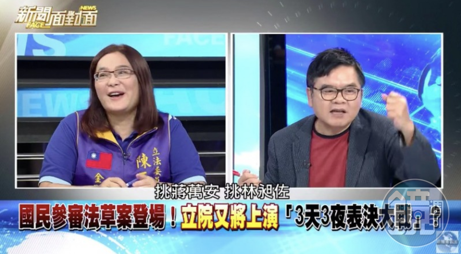 陳玉珍原本面無表情。(圖片翻攝《新聞面對面》Youtube)之前才因為抱緊蔣萬安的陳玉珍,這次因為要搶選票把手伸進林昶佐褲襠裡面「又摸又抓」,莊瑞雄也在節目虧她「都挽仙桃」,陳玉珍則笑著否認,但臉上的微笑藏也藏不住,似乎有些被說中的心虛。