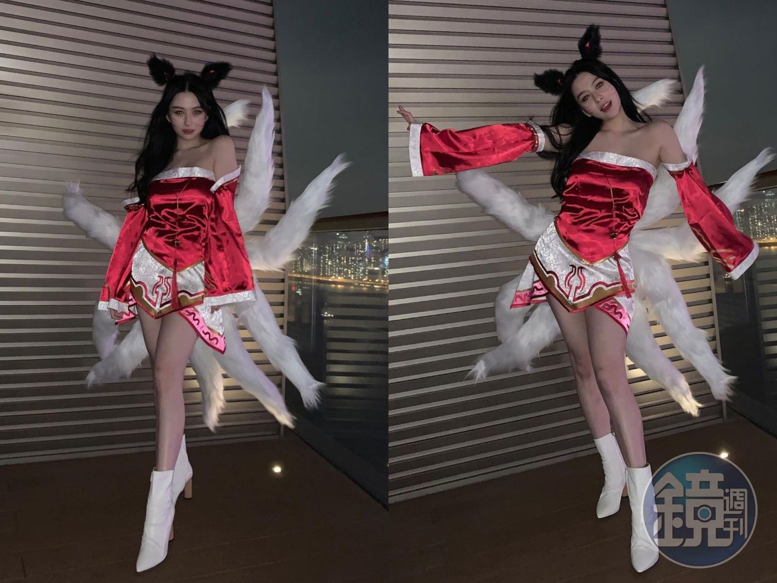 19歲的沈月在IG貼出她為萬聖節派對精心打扮的造型照片,當晚她扮成電競遊戲《英雄聯盟》的九尾狐角色「阿璃」,秀出香肩和一雙長腿;她穿著紅通通的上衣與白色滾紅邊的短裙,並在身後插上9條雪白狐尾,沒有狐媚的妖氣,倒是仙氣十足。