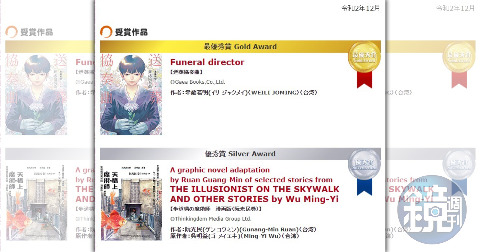 阮光民以改編自吳明益小說的《天橋上的魔術師圖像版:阮光民卷》奪下「銀賞」,其作品《用九柑仔店》去年改編為電視劇,近期也推出新作《九天少年》;D.S則以性別議題的《百花百色》奪下「銅賞」,讓日本國際漫畫賞的金、銀、銅賞都有台灣漫畫家身影。