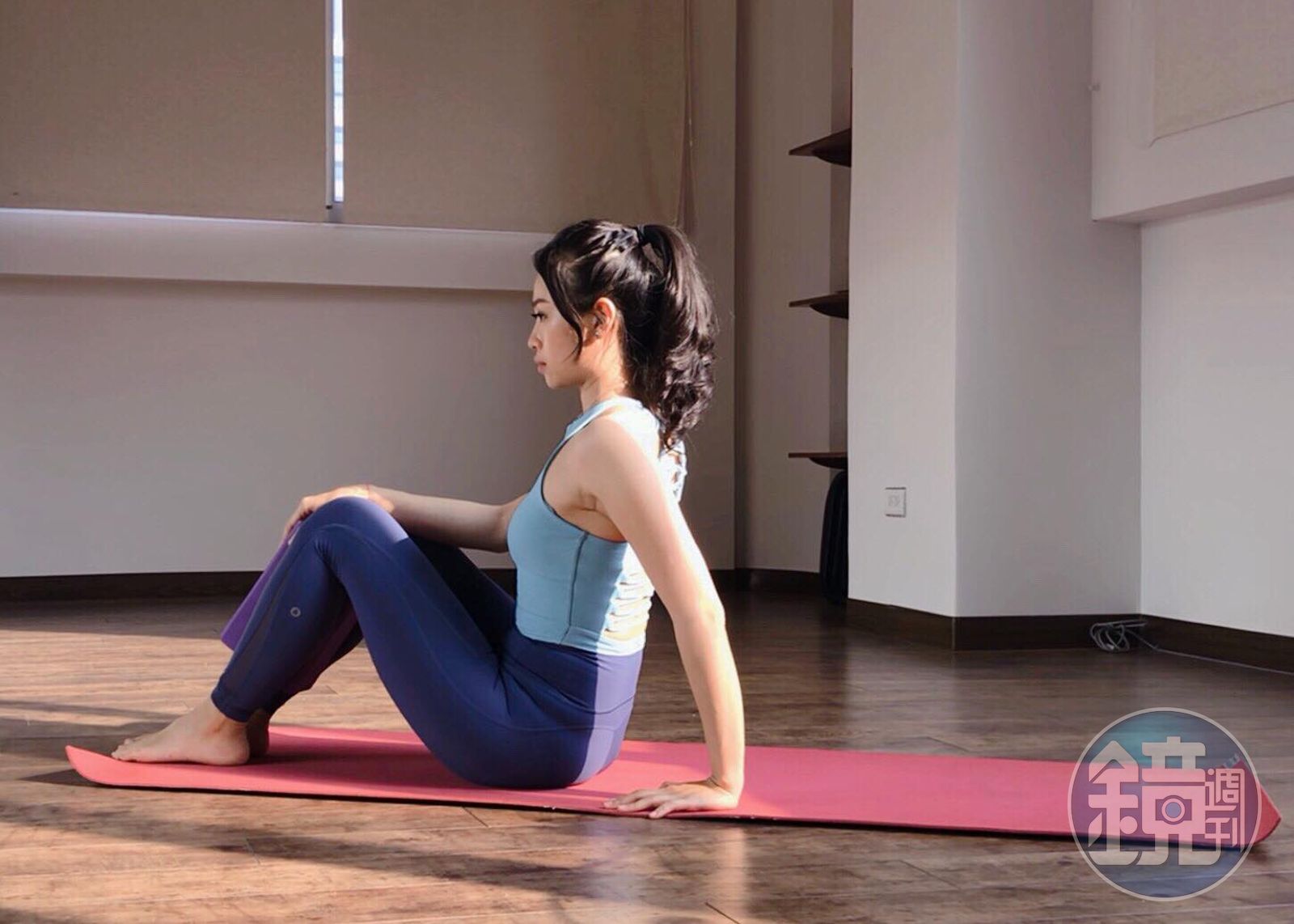 CHA CHA老師指出,此動作的重點是藉由腹部收縮讓膝蓋靠向胸口,並將腳跟抬高並往中間集中,來鍛鍊腹部核心、大腿內側。