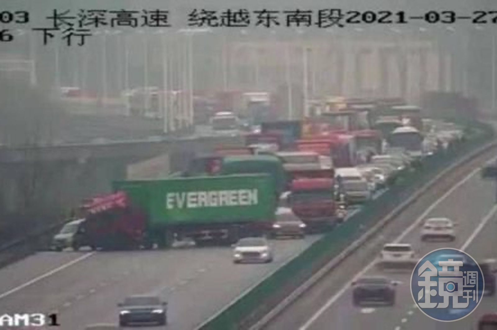 監視器畫面截圖中,可以看到時間顯示為2021年3月27日9點55分,事故地點為通行於大陸長春與深圳之間「長深高速公路」的南京附近路段,一台印有「EVERGREEN」字樣的大貨車撞到前方的銀色休旅車,車身橫亙在路中央,造成後方全面回堵。
