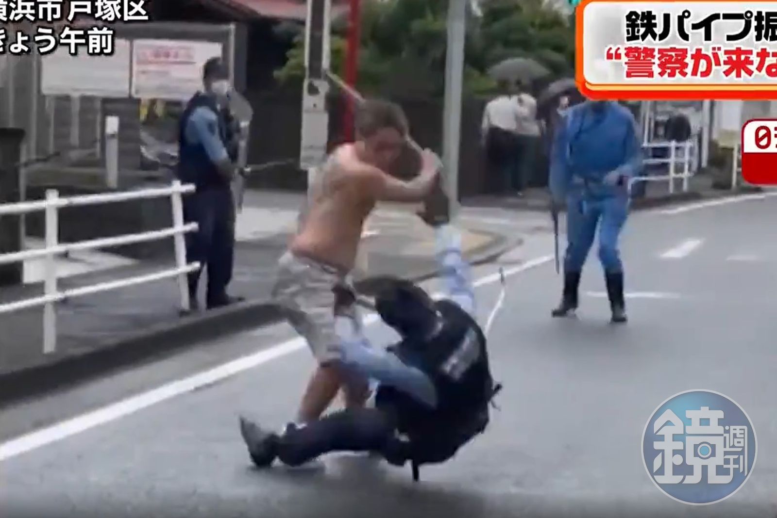 日本橫濱一名上半身赤裸的男子,昨(29日)在警方到場處理交通事故時試圖棄車逃逸,手持鐵棍與警方展開追逐。雖然最後遭到制伏,但過程中5名警員一度拿嫌犯沒轍,一名警員甚至自己摔倒在路上,畫面讓網友不禁搖頭感嘆「日本警察真的太弱了!」