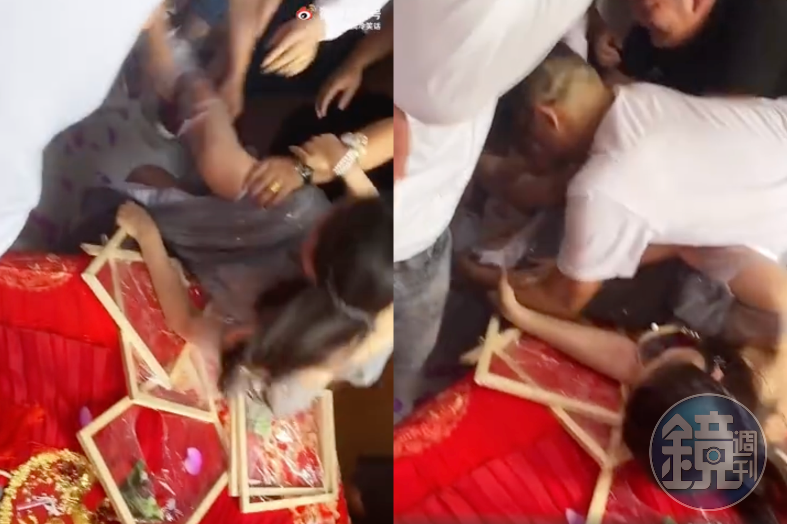 另支影片中,大批男性包圍一名伴娘,喊著要替她拔腿毛,伴娘毫無反抗之力,直接跌坐床上,眾男掀開她的長裙,抬起她的腿嚷嚷著要除毛,一名白衣男子更直接重壓在伴娘身上,部分男子則趁機撫摸她的腿,不堪畫面就連大陸網友看了也直搖頭。