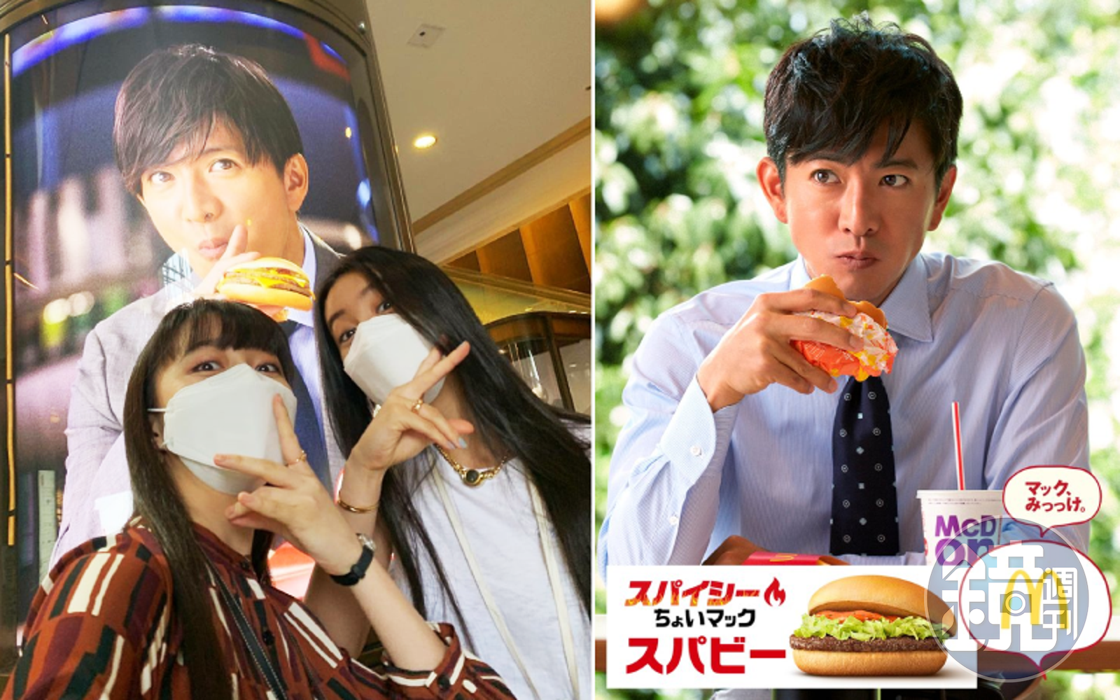 木村拓哉在日本曾多次擔任麥當勞的漢堡代言人,因曾在廣告中展現獨特的拿漢堡手勢,造成話題。近日木村再度拍攝麥當勞的新廣告,沒想到兩個女兒木村光希與木村心美,逛街時看到爸爸的廣告看板,學起他拿漢堡的手勢自拍,意外造成兩姊妹出道後,與男神爸爸首次同框的合體照。