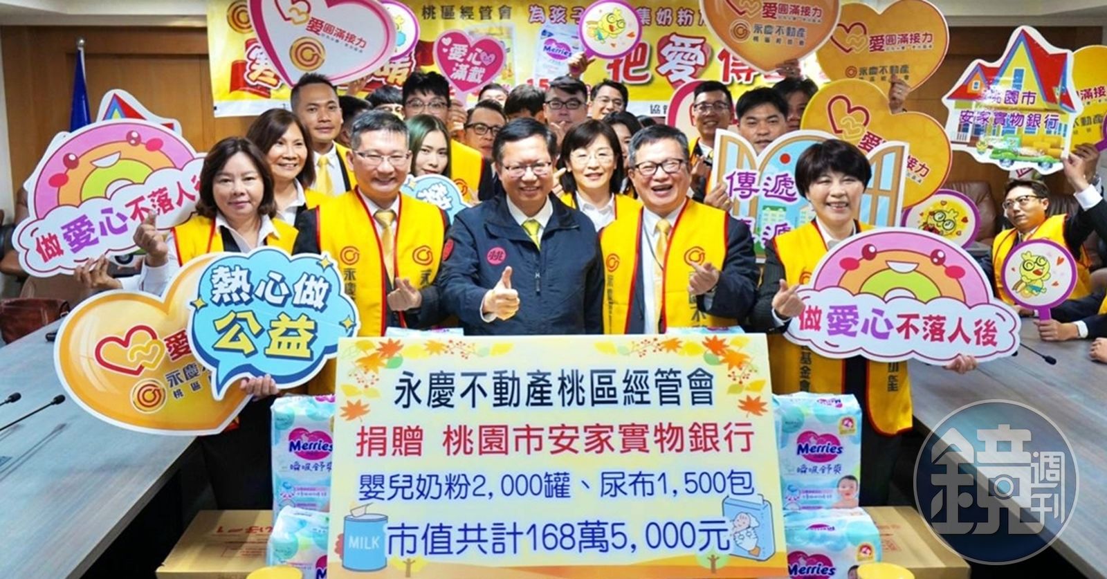 「寒冬送暖,為孩子募集奶粉尿布」公益活動12月10日在桃園市政府舉行捐贈儀式,由永慶不動產桃園區經管會會長周業泰代表捐贈2000罐奶粉和1500包尿布給桃園市政府社會局安家實物銀行,當日由桃園市市長鄭文燦親自出席,頒贈感謝狀給永慶不動產桃園區經管會,未來這2000罐奶粉和1500包尿布會分批將送至弱勢家庭家中,紓解在地弱勢家庭的育兒壓力,讓幼兒們能健康的長大。