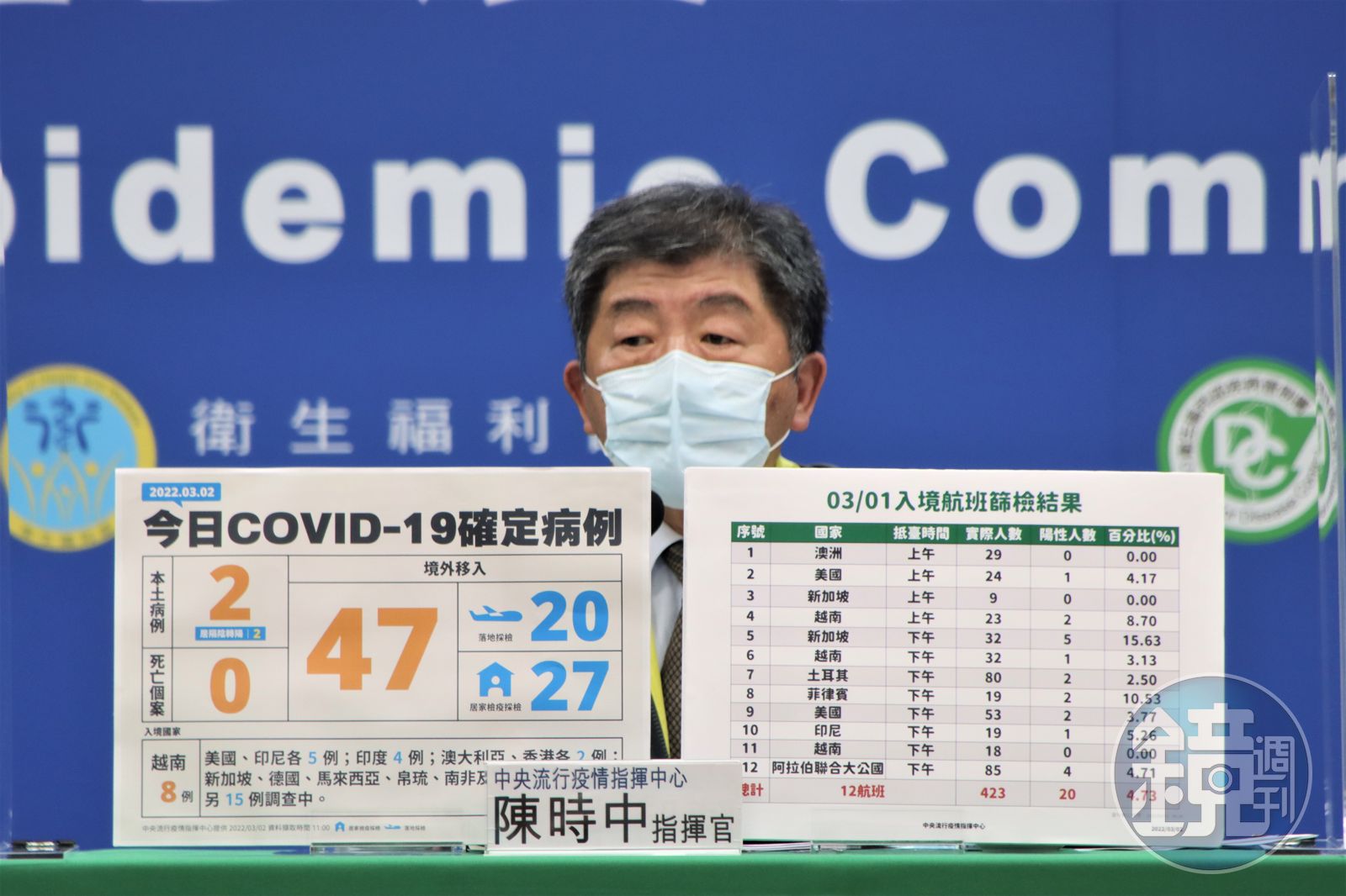 指揮中心指揮官陳時中指出,今日新增2例皆為米迪幼兒園衍生個案,2人為1名女性、1名男性,年齡在10多歲至20多歲之間,皆為居隔期間陰轉陽採檢,20多歲女性打過2劑BNT疫苗,3月1日出現咳嗽、流鼻水症狀,10多歲男性為國小電腦老師學生,未接種疫苗。本次群聚匡列對象較廣,但沒有繼續外擴,整體看來相對樂觀,而米迪幼兒園衍生已有26人染疫。