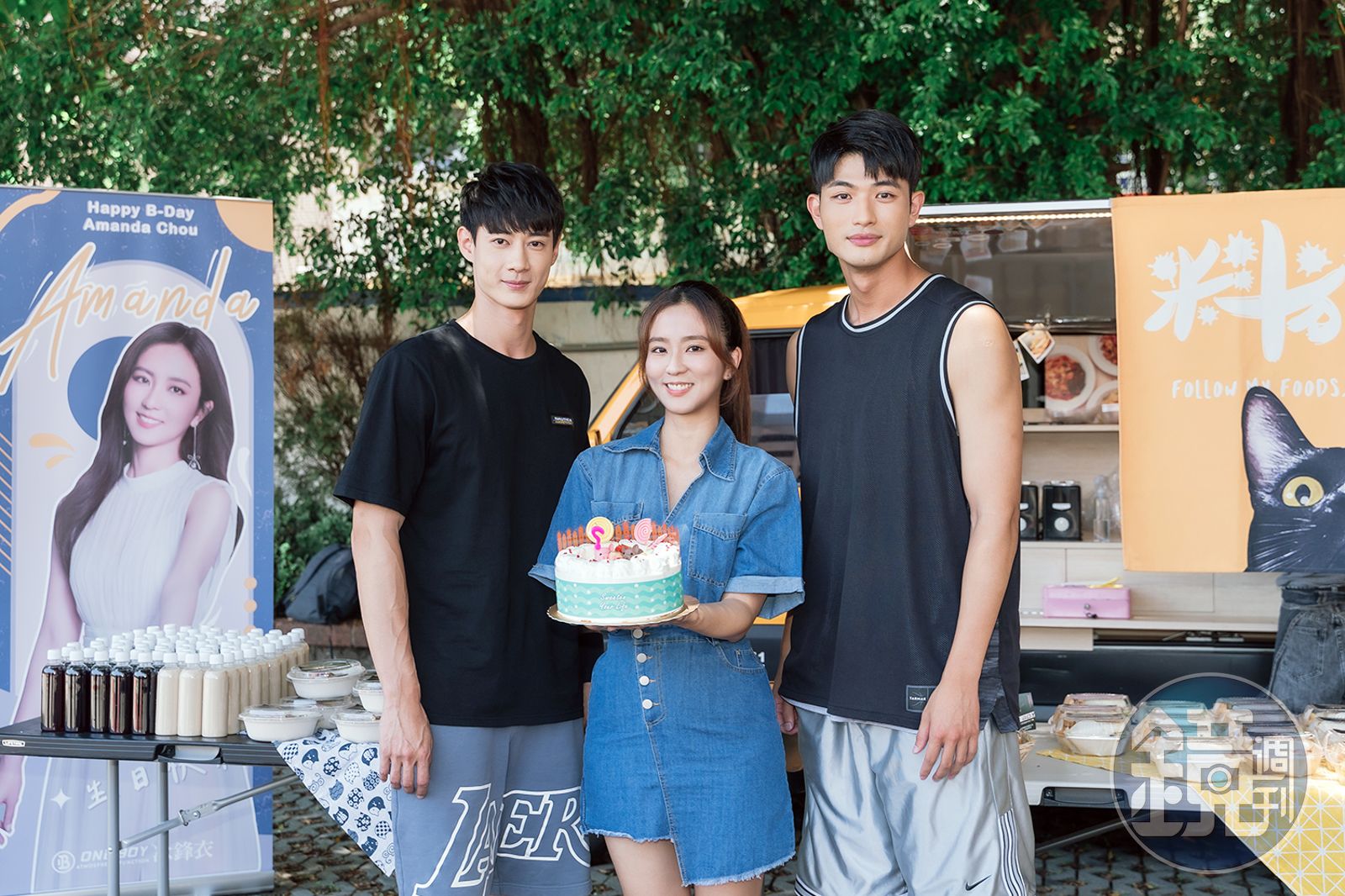 周曉涵與同為獅子座的黃柏峰(左)、王新凱一起慶生。(TVBS提供)