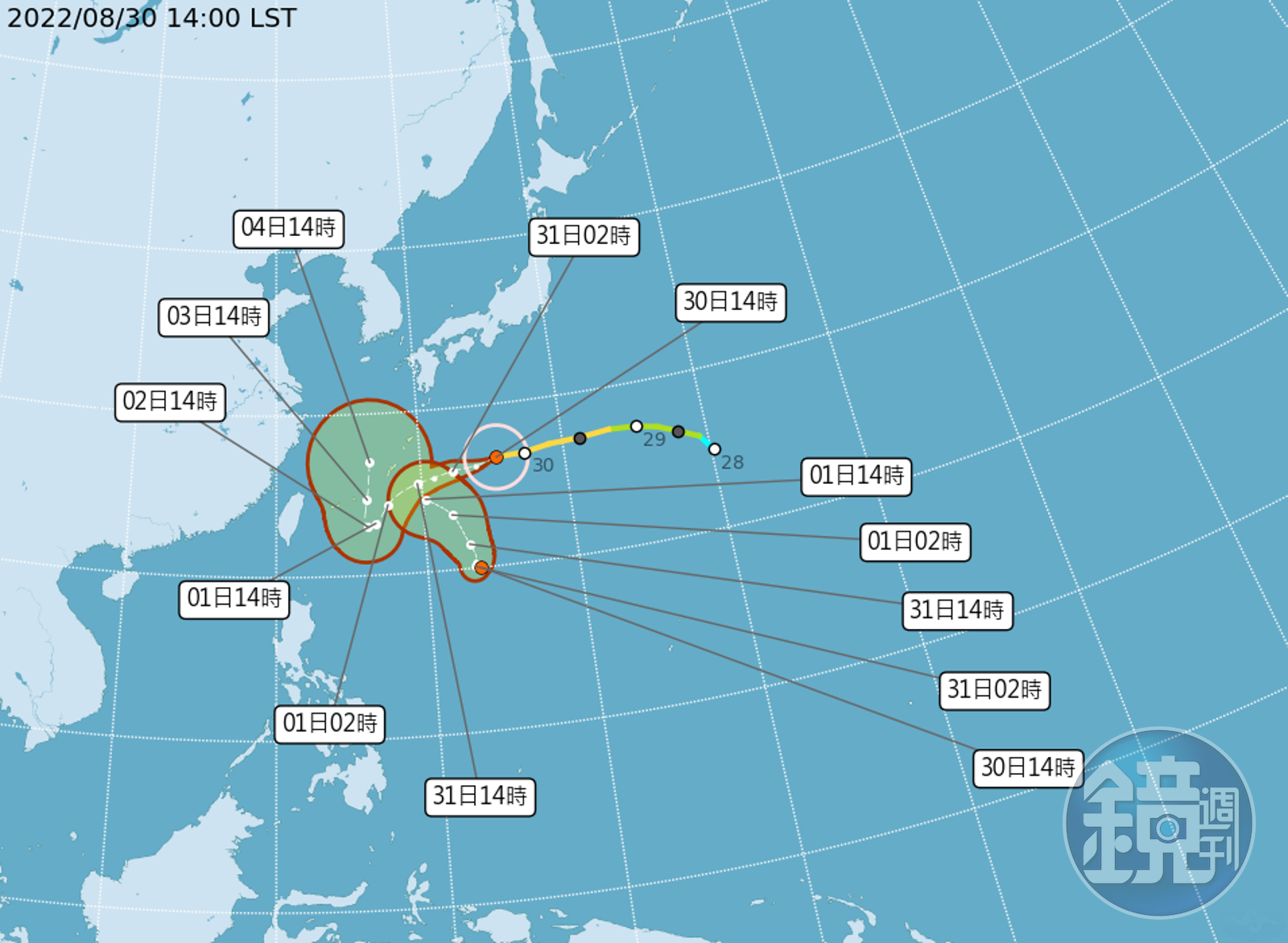 氣象局預估路徑上,目前軒嵐諾雖持續往西南對台而來,不過氣象局預報員劉宇其指出,週四(9月1日)、週五(9月2日)時因引導氣流減弱,軒嵐諾可能會在琉球附近海面打轉,最接近台灣時間推測落在週四到週六(9月3日),仍可能發布海上颱風警報;而之後氣象局則預估軒嵐諾路線會往北偏移。
