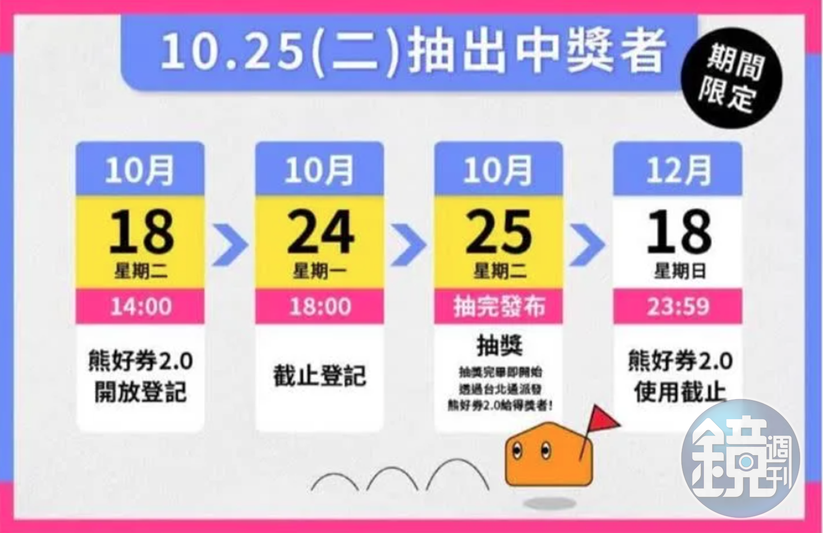 台北市政府日前推出「台北熊好券2.0」,類別包括住宿券、饗購券、藝文券、運動券、市集券及農好券,一位民眾可選2種票券進行抽獎,最高可拿2000元,25日已將中獎名單公布於台北通APP、台北市政府官網查詢,票券可使用至12月18日23時59分止。有餐飲業者搭上順風車,特別推出「扭蛋機抽獎」活動,最高獎項為1000元的百貨禮券等獎品,藉由在年底這波活動中進行另類行銷,盼望能成功搶市!