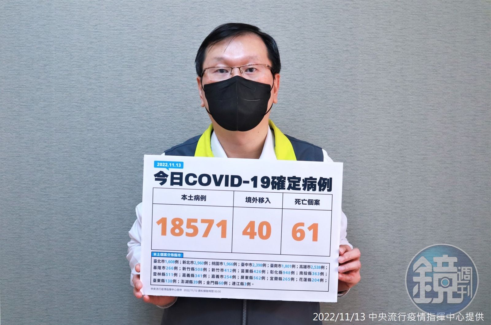 指揮中心指出,今日新增61例本土病例死亡個案,為37例男性、24例女性,年齡介於40多歲至90多歲以上,皆屬重度感染、60例具慢性病史、36例未接種3劑以上COVID-19疫苗。確診日介於今年9月20日至11月10日,死亡日期介於10月20日至11月10日,詳如新聞稿附件。