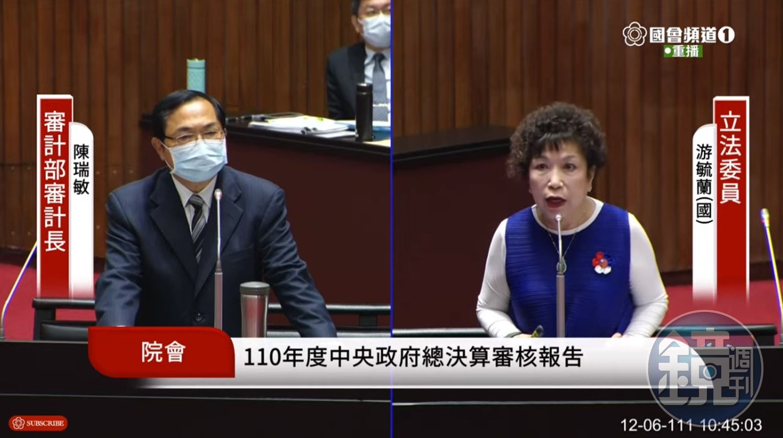 審計長陳瑞敏(左)今在立法院質詢時回應十倍券相關問題時表示,國家債務緩緩上升,應該控管財政。(翻攝自國會頻道)