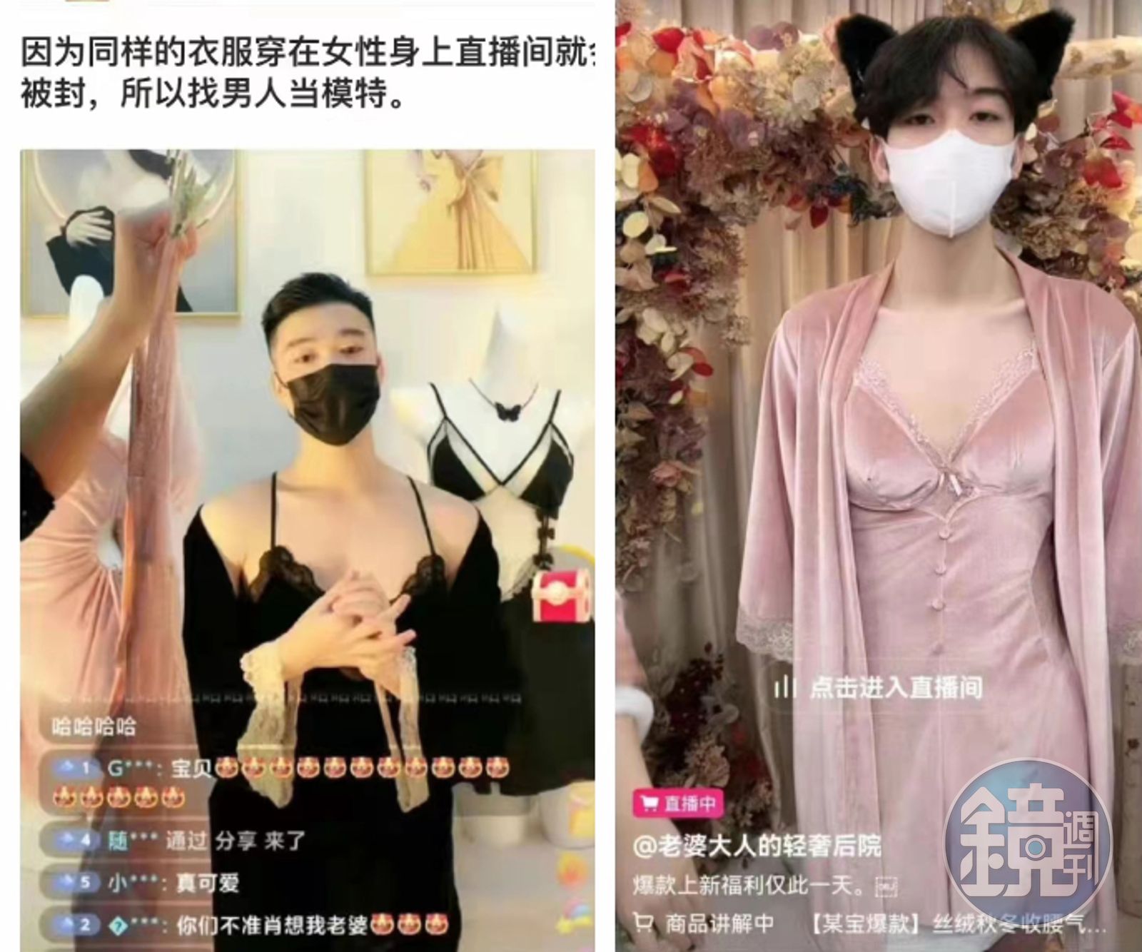 一名網友「小徑殘雪」在推特擷圖分享,畫面中2位長相清秀的妖嬌小鮮肉身穿性感的情趣內衣在鏡頭前搔首弄姿帶貨。他也解釋,因為中國政府規定女性在直播間內不能穿內衣等裸露衣物出鏡,否則直播帳號將會因為「涉嫌傳播淫穢訊息」立刻被永久封鎖,「那如果非要在直播間帶貨賣女性內衣該怎麼辦呢?很簡單,找男人來穿!」