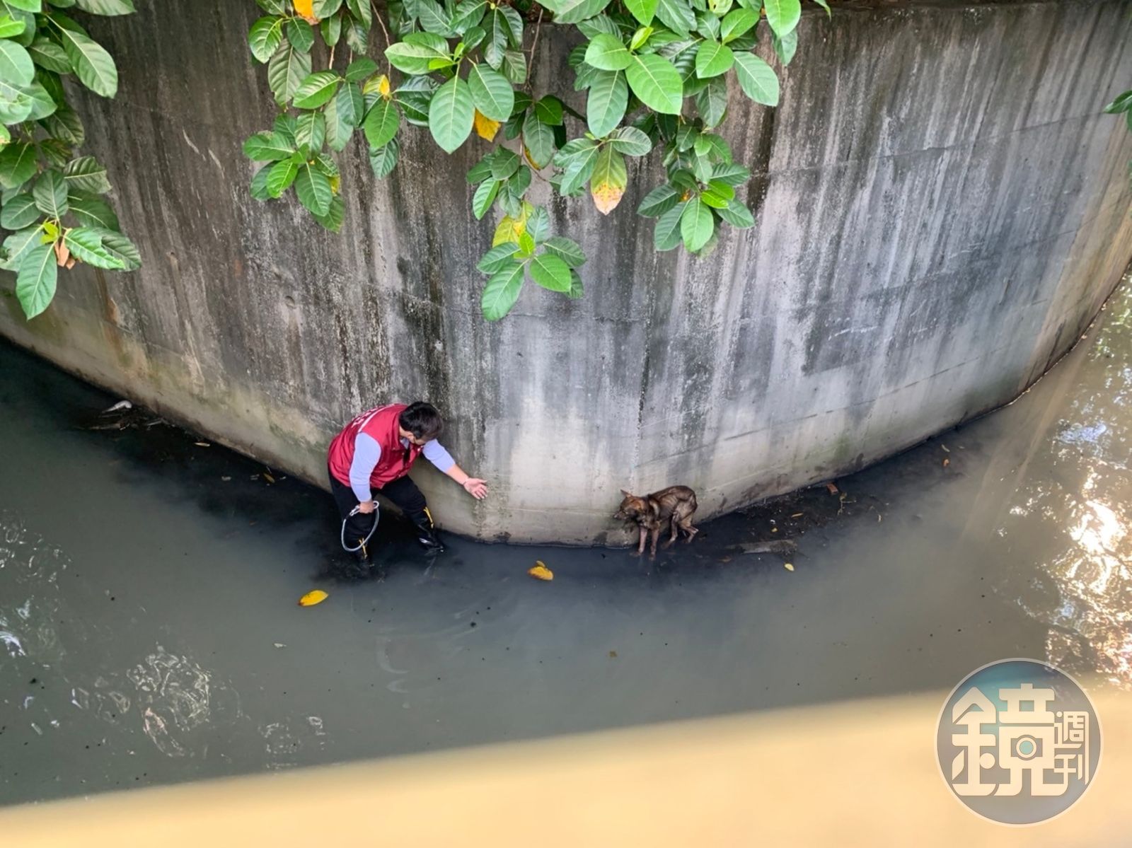 樹林區林小姐表示,平常上下班都會經過這約3層樓高的大排水圳,當日下班經過大排時有聽到小小的汪汪聲,因大排水圳寬又深,加上兩側樹木枝葉茂密,一時間也沒看到任何動物。沒想到第二天上班時又聽到小小的汪汪聲,這次她努力找了一陣子,終在被枝葉擋住的大排水圳的陡峭壁面下,看到了那隻非常瘦弱的棕毛犬。因大排水圳兩側相當平滑陡峭且無出口,林小姐擔心受困棕毛犬體力不濟無法自行脫困,加上她也找不到可以下去的路,實在不知道該怎麼辦才好。