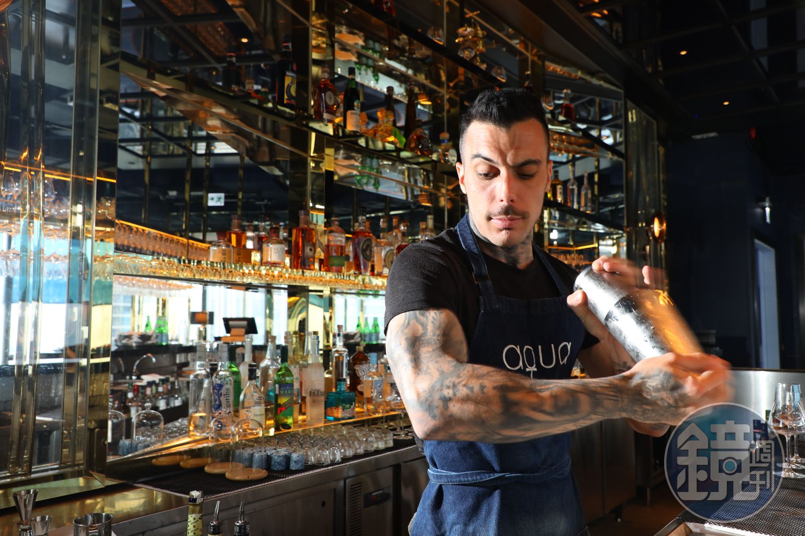 AQUA採用坊間少見的雙主廚形式,請來義大利籍主廚Andrea Mura與日籍名廚岩橋達也雙手聯彈,同時供應極為地道的義大利與日本料理。執掌吧台的也是強將,挖角出生在義大利托斯卡尼,之後歷練過杜拜、瑞士、美國拉斯維加斯等地,2年前才來到香港發展的Lorenzo Coppola擔任吧台創意總監,熱情洋溢的Lorenzo雖然非常活潑可愛,但講到自己的調酒專業可是一絲不茍。