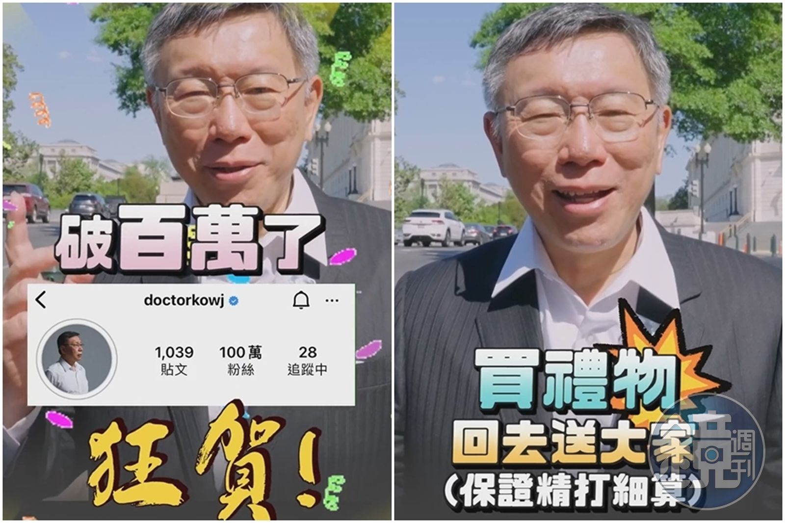 柯文哲積極經營社群平台,除了臉書粉專、IG、推特、YouTube,甚至還有TikTok帳號。對於IG迎來百萬粉絲追蹤,柯文哲也打廣告,歡迎大家追蹤他各個社群,也宣布將舉辦抽獎,會在美國買禮物送大家。