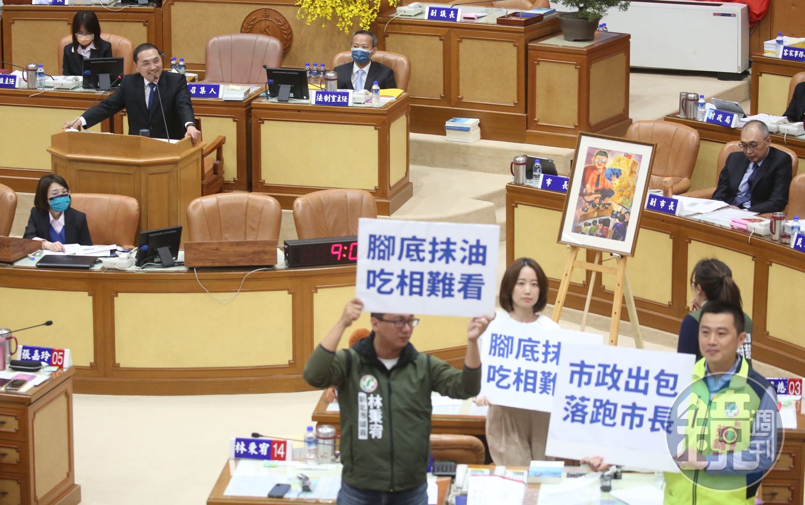 新北市議會國民黨團已為了讓侯友宜可以接受徵召,下半年安心選總統,將市政總質詢提前到明天開始,侯友宜今則先來到新北市議會進行施政報告,而綠營也有備而來,高舉手板「腳底抹油、吃相難看」「市政出包、落跑市長」等口號,狠諷侯友宜。綠營議員質詢期間也多次問侯友宜是不是準備落跑選總統、是否會留下市政爛攤子給新北市民?而侯僅重申,為國家做更多的事情都是他應該做的事。