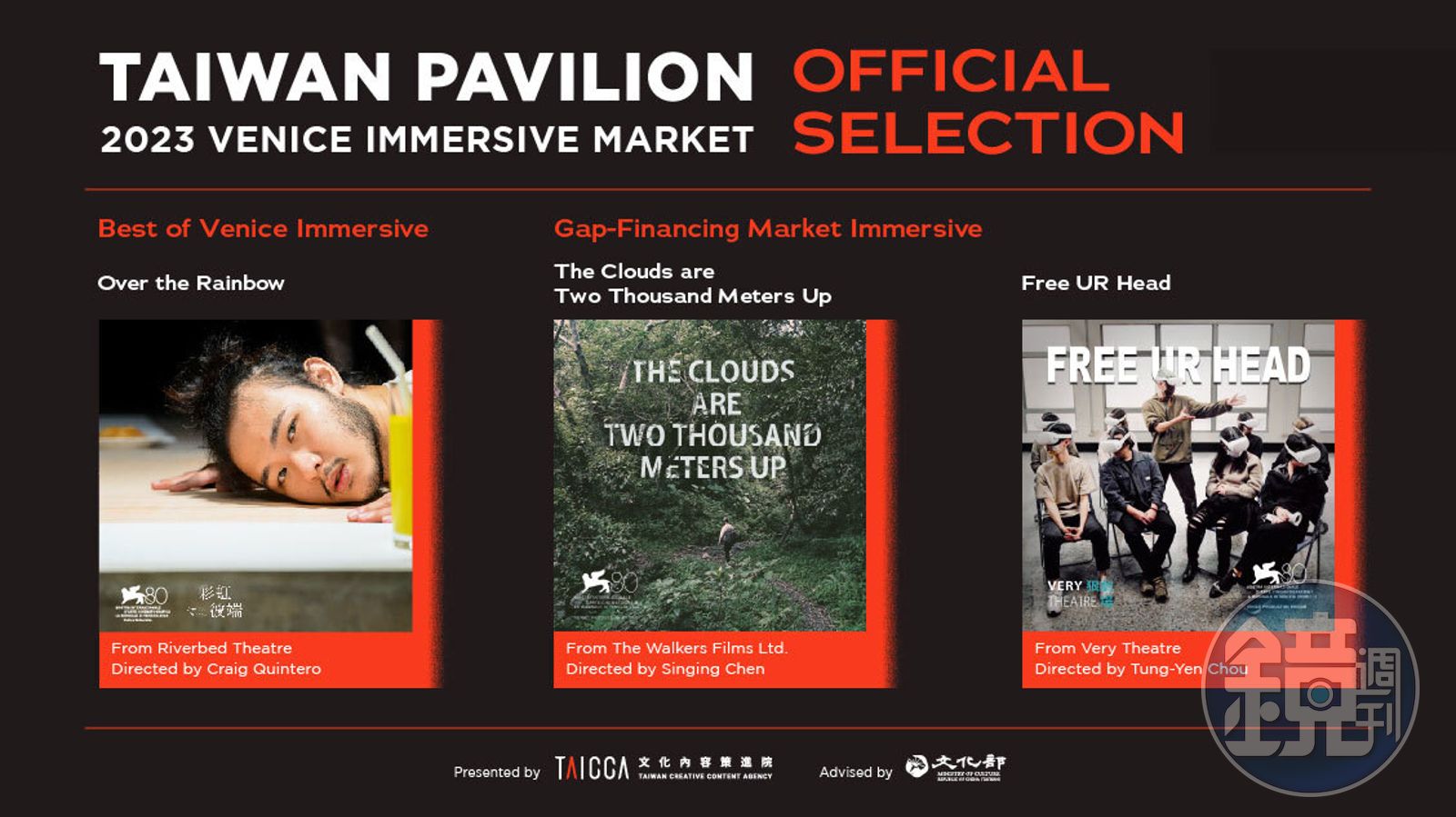 與影展同時舉辦的威尼斯市場展(Venice Production Bridge)中,《雲在兩千米》和文策院支持的《放開你的頭腦》等兩部臺灣VR新作參與「合資市場展」沉浸式內容項目(Venice Gap-Financing Immersive)。文策院也在「沉浸式內容市場展」(Venice Immersive Market)設立實體和線上臺灣館,完整展現臺灣在沉浸式內容創作的產業優勢。