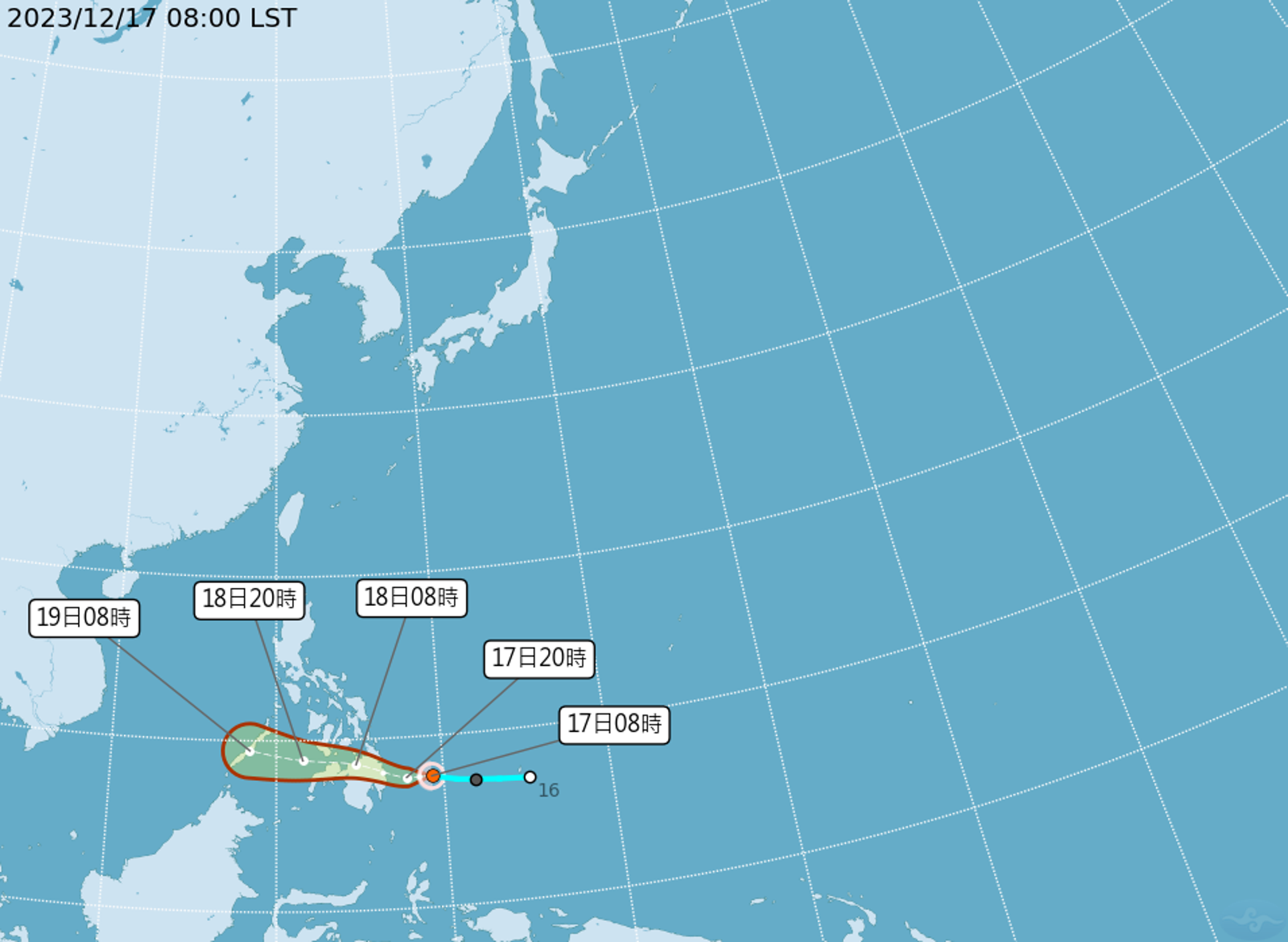 氣象署說明,鯉魚17日8時中心位置在在北緯7.6度,東經129.3度,以每小時17公里速度,向西進行。中心氣壓1002百帕,瞬間最大陣風每秒25公尺,七級風平均暴風半徑80公里(西北側100公里、東北側50公里、西南側100公里、東南側50公里)。 氣象粉專「台灣颱風論壇|天氣特急」昨(16日)在臉書說明,因為北方冷高壓強勢壓境的關係,鯉魚颱風穿越菲律賓進入南海後會往馬來西亞前進,對台灣沒有影響。