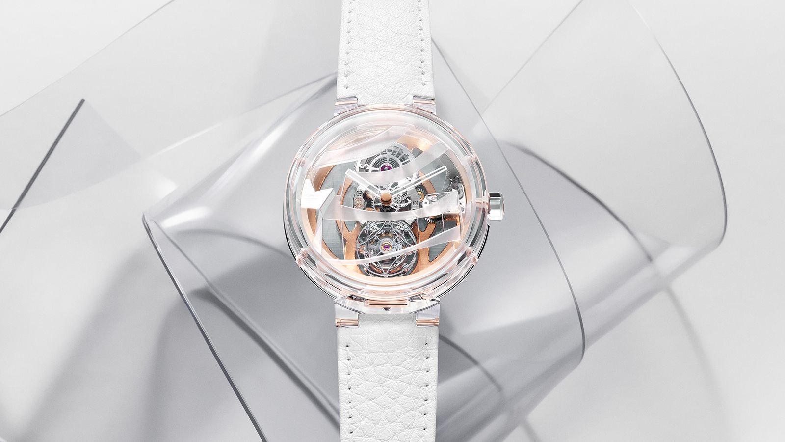 通透的藍寶石水晶面盤上如裝飾般的的霧面設計,是Frank Gehry從LV首爾旗艦店獲得的靈感,波浪狀的玻璃屋頂結構,在光線的照射下看起來像水母般的通透生物,隨著都可能跟著風的舞動飄浮起來那樣的具有生命力。面盤六點鐘下半部的長方形結構是玻璃船帆的象徵,還特別做出建築裡金屬絲線般的垂直線條十分細緻,一比對首爾旗艦店就會看出它是源自這裡的端倪,九點鐘位置3D感十足的摺角也很讓人驚豔,以聯名、材質、加上日內瓦印記,為這款Tambour Moon飛行陀飛輪,在LV的製錶史上留下了一篇有故事可以說的章節。