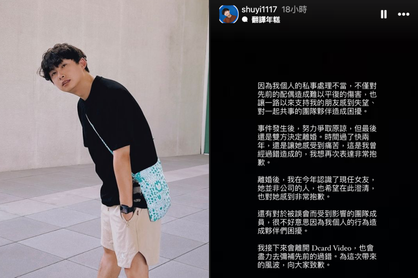今凌晨大書則於IG限時動態發文致歉,表示對先前的配偶造成難以平復的傷害,曾努力爭取原諒,但最後還是雙方決定離婚,不過也澄清自己現今的女友是離婚後才認識,並非公司的人,聲明中除了多次道歉也宣布離開Dcard Video。