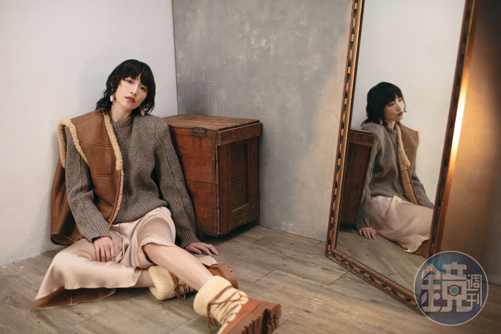 羊毛針織墊肩毛衣 NT$61,400 by BOTTEGA VENETA;捲曲長毛羊皮無袖背心 NT$175,000 by CELINE BY HEDI SLIMANE;絲質飄逸感長裙 NT$73,400 by FENDI;CELINE Bulky羊毛革及牛皮革繫帶皮靴 NT$59,000 by CELINE BY HEDI SLIMANE;純銀造型耳環 價格店洽 by BOTTEGA VENETA。