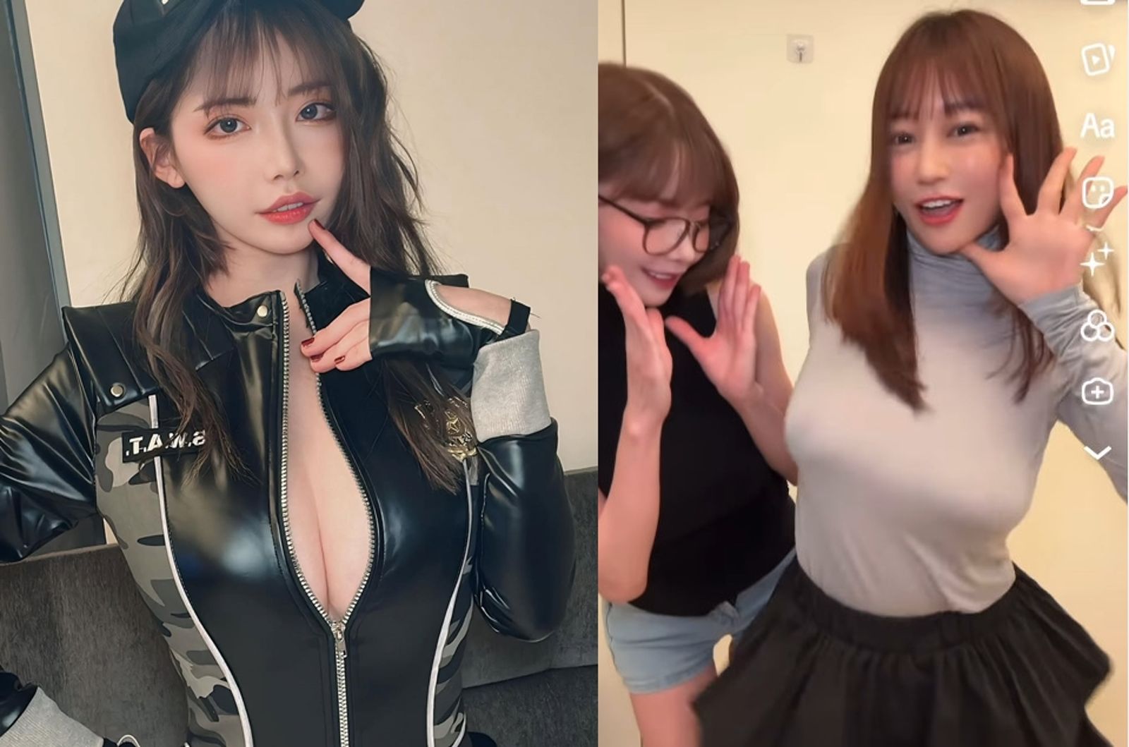深田詠美和macca日前在社群平台公開了一段引人注目的合體影片,雙方對決無罩抖奶畫面成為網友討論焦點,影片中,身形纖瘦的深田詠美穿著黑色上衣,胸部搖晃程度較不明顯,視覺上略顯下垂。而macca的淺灰色貼身上衣則凸顯了其豐滿雙峰的晃動,連深田詠美都難以將目光從波動的巨乳上移開。