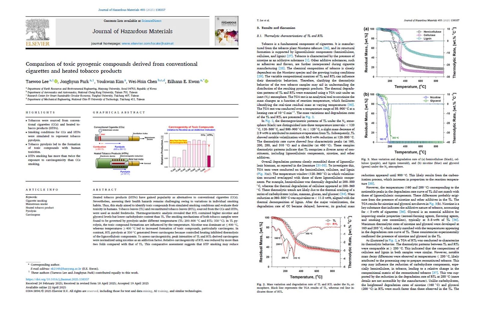 台韓學者合作的最新研究報告「Comparison of toxic pyrogenic compounds derived from conventional cigarettes and heated tobacco products」,透過模擬實際吸菸條件,比較紙菸與加熱式菸品在高溫條件所釋放的37種熱裂解產物(pyrogenic compounds)。研究顯示,紙菸燃燒溫度可達攝氏800度,生成大量有害物質;加熱式菸品僅以約攝氏350度加熱,產生的熱裂解產物顯著減少。