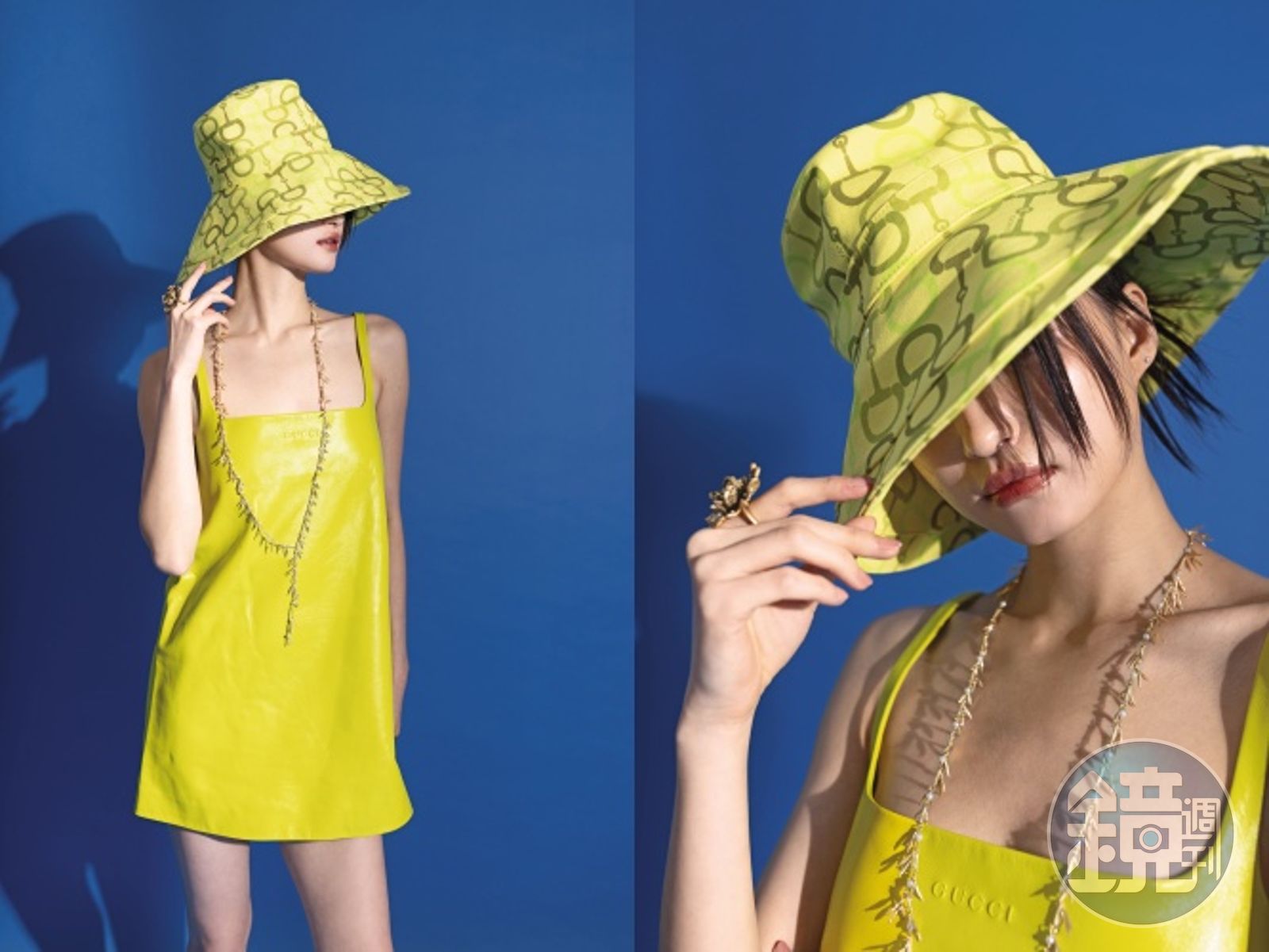 不規則反領連身裙 NT$143,000 by FERRAGAMO / V For Vuitton項鍊 NT$55,500 by LOUIS VUITTON / 金色飾面手鐲 NT$33,500 by CELINE / FORMES ABSTRAITES金色飾面金字塔形戒指 NT$18,500 by CELINE