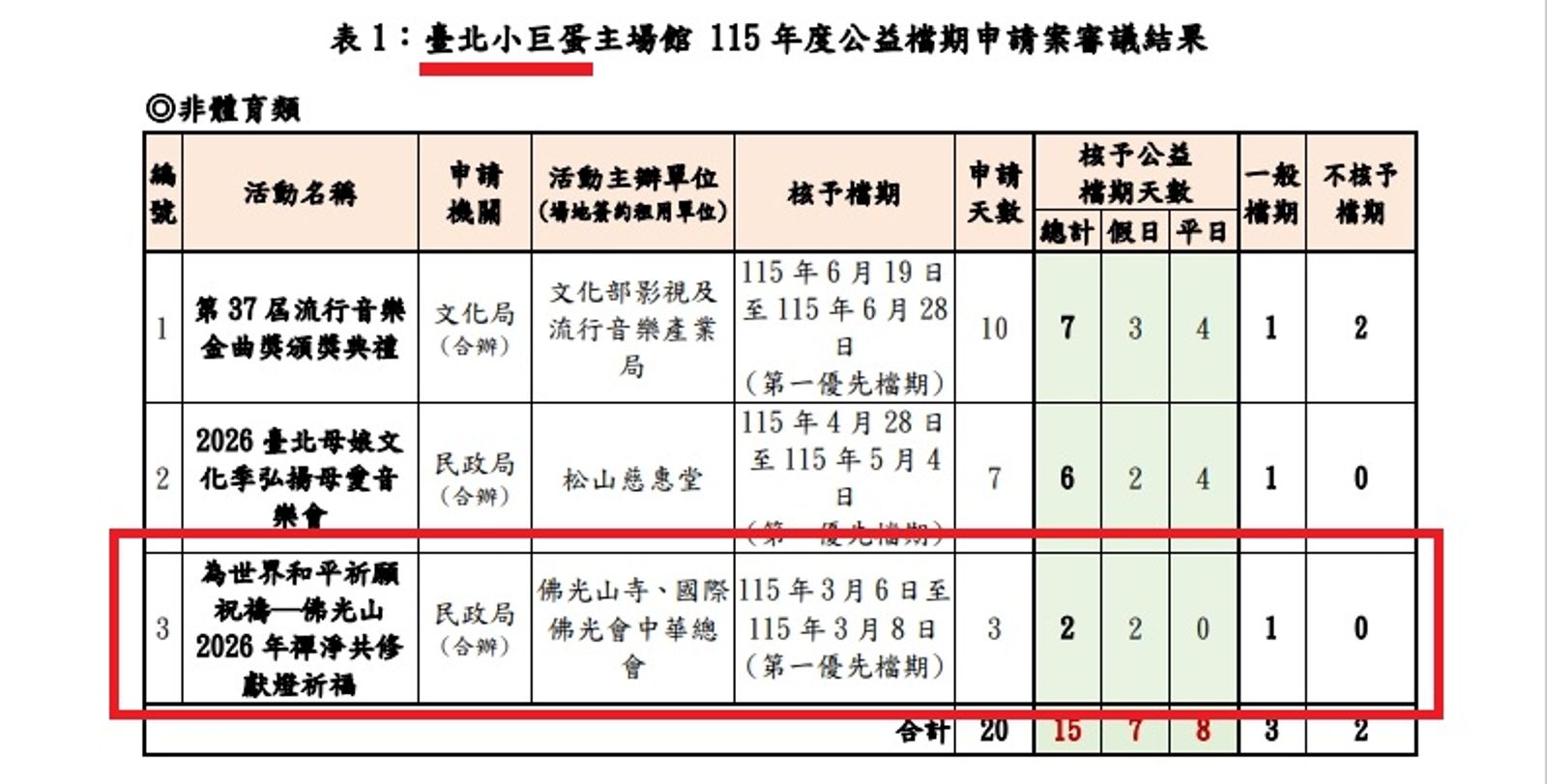 直到今年初,佛光會規劃明(2026)年辦理祈福活動,向民政局提出3天台北小巨蛋的公益檔期申請,經北市府2月21日公益檔期審議委員會審議,核予佛光會2天公益檔期與1天一般檔期。未料,此時傳出台北大巨蛋仍有剩餘回饋檔期(即公益檔期),且慈濟準備向市府遞案申請消息,已拿下小巨蛋檔期的佛光會,火速與市府高層聯繫,打響了這場大巨蛋爭奪戰。