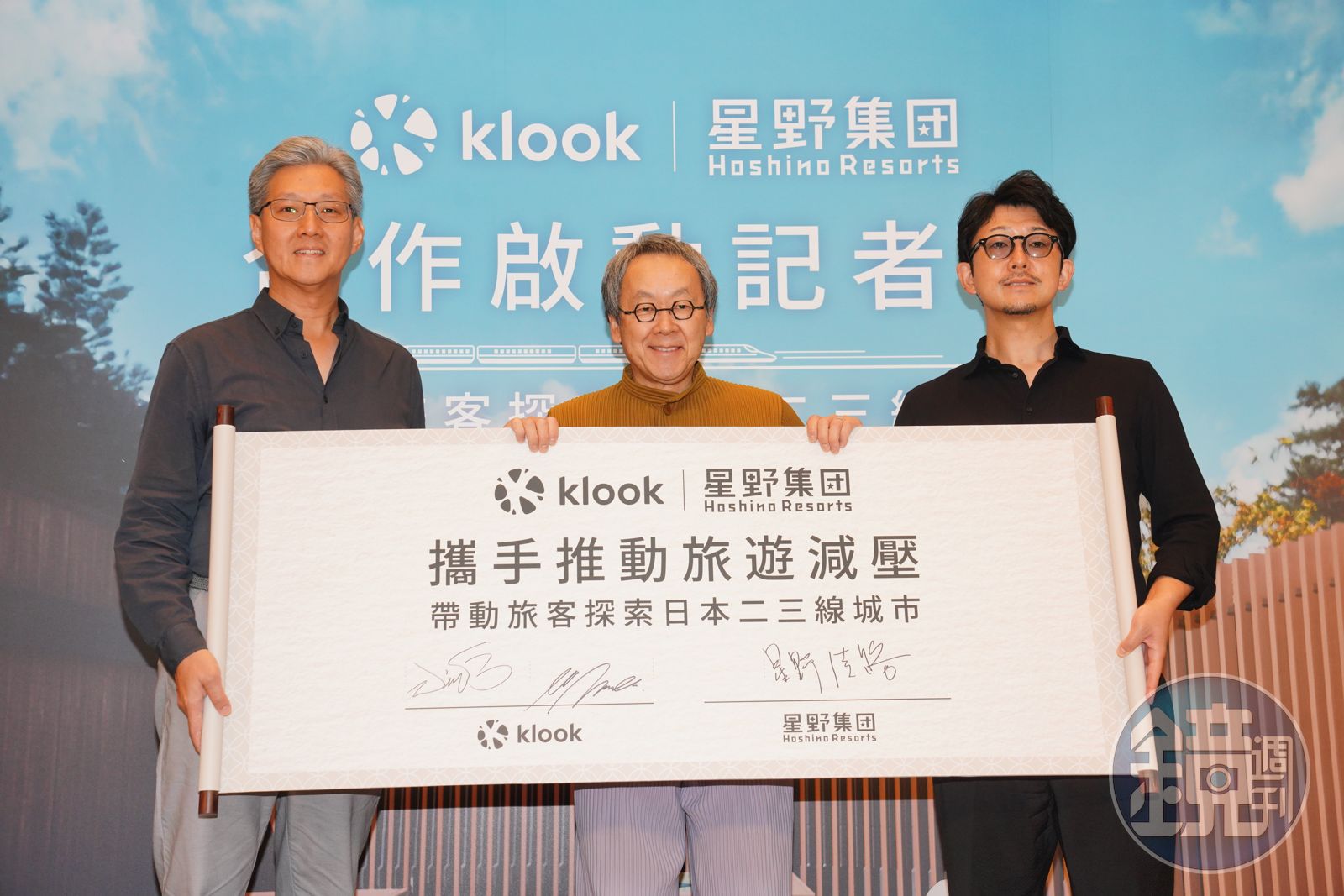 Klook 今(11)日宣布,與日本飯店品牌星野集團展開策略合作。首波合作推出結合JR Pass和精品溫泉旅館線「界」的「住宿交通套票」。Klook商務長范偉能(Wilfred Fan)和日本區總經理增田航(Wataru Masuda),以及星野集團代表星野佳路,皆特別訪台,宣傳本次合作。