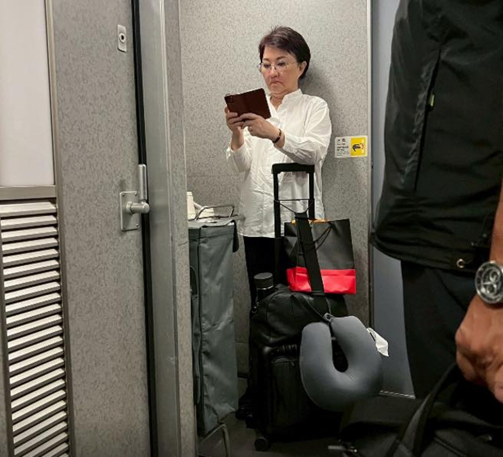 臉書與社群21日瘋傳一張照片,稱20日深夜的高鐵上,有民眾目擊盧秀燕因搶不到座位,只能站在車廂角落滑手機返台中,引來不少網友按讚留言「好親民」「好辛苦」。有眼尖網友注意到她身上物件充滿生活味,包括皺巴巴白襯衫、靠枕、保溫杯與紙袋等,營造出樸實形象。
