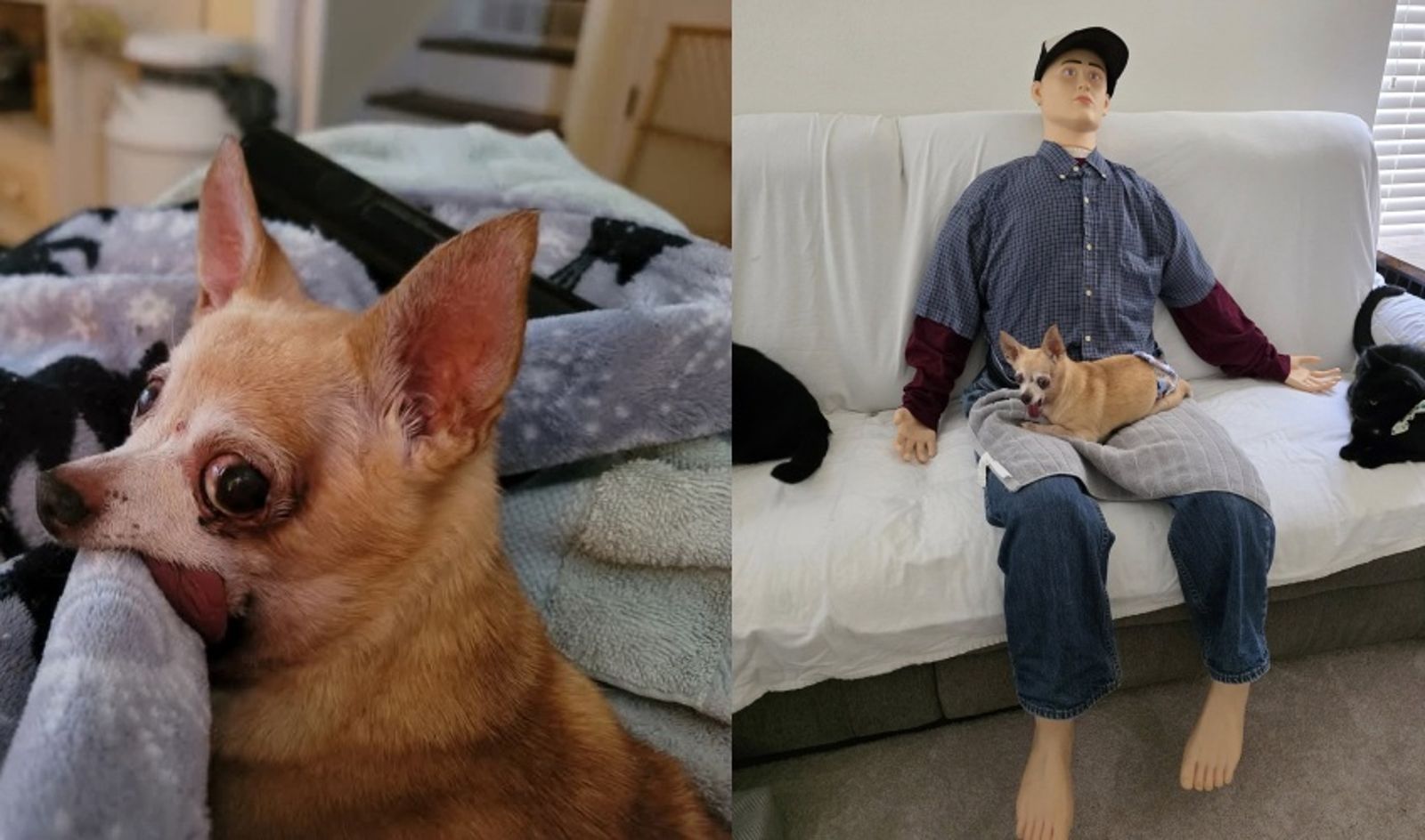 格雷斯笑說,沒想到「Bob Jr.」不只受到 Dingo 的喜愛,連家裡的貓咪與其他狗狗也會輪流坐在假人腿上,把它當成專屬「陪伴椅」。