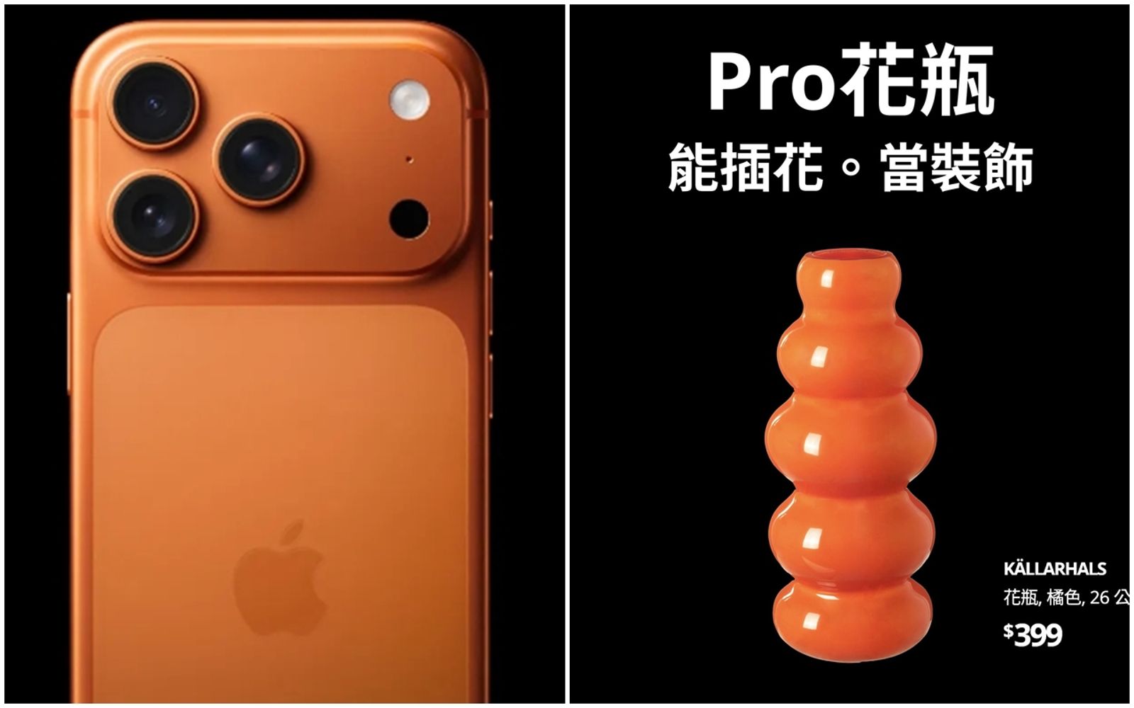 IKEA也搭上這波iPhone 17熱潮,臉書小編曬出「Pro花瓶 能插花。能裝飾」文案,還強調這款不用等到9月12日,現在就能立即購買,花瓶顏色為橘色,售價399元。