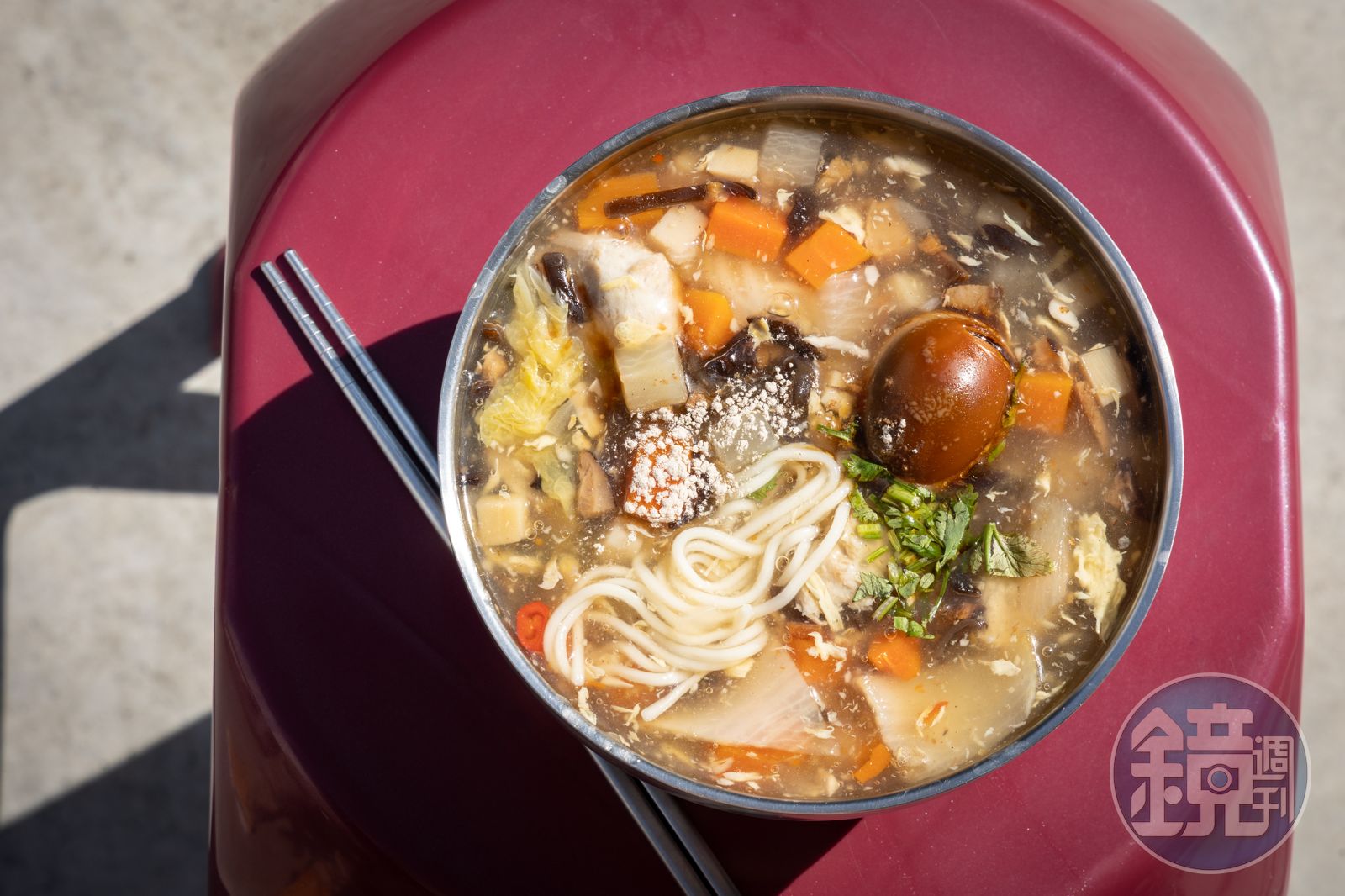 魯麵湯裡的料有紅白蘿蔔和山東白菜增甜、桶筍添酸、蛋絲、香菇,所有食材都是手切成丁,麵條是只加了一點點鹼的油麵,不管香菜多貴,都很捨得給客人。當然還有一個台南無所不加的主角:虱目魚焿。