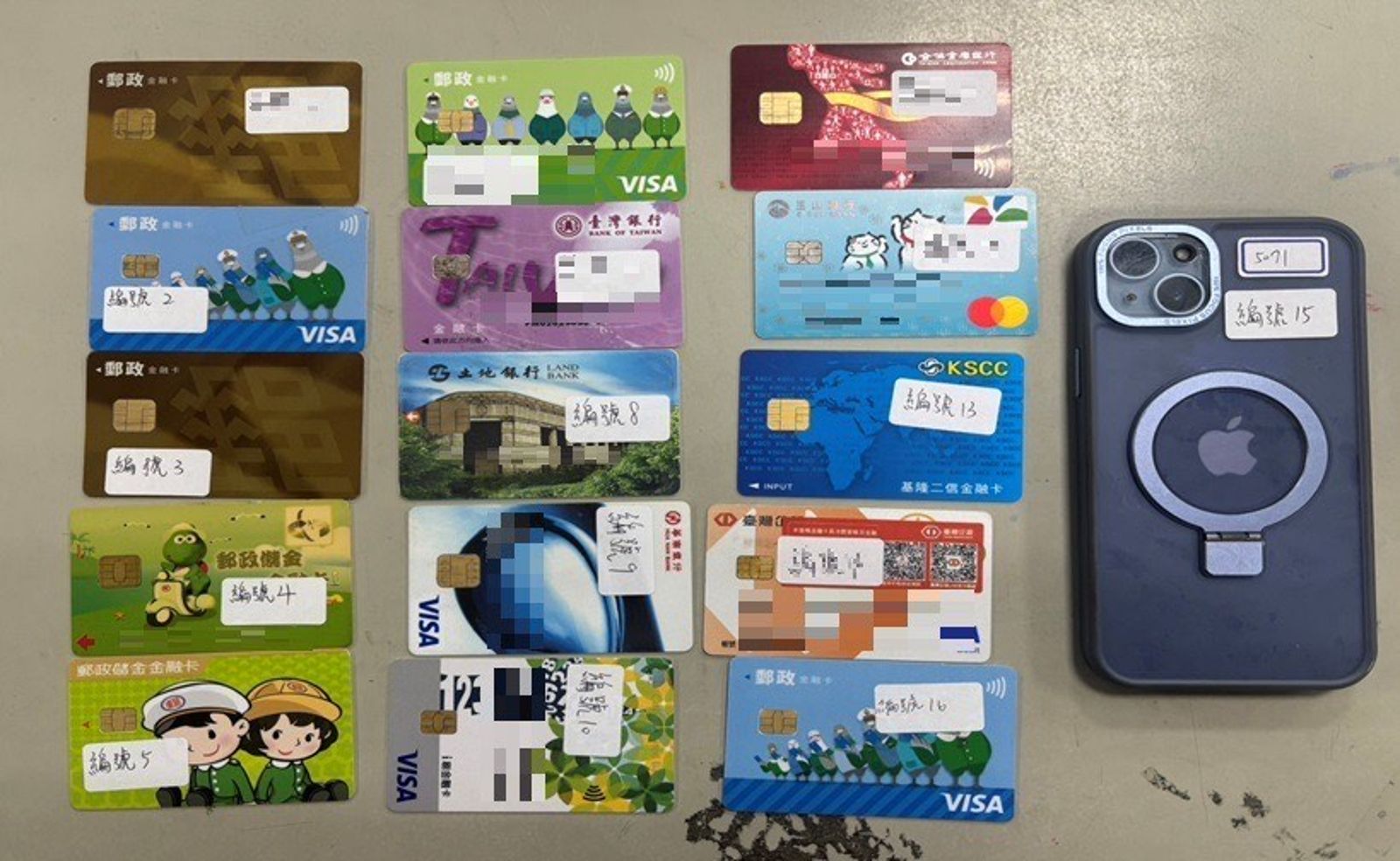 土城警方在馬男身上起出14張非其本人的金融卡。(翻攝畫面)發布時間:2025.10.12 17:18 臺北時間