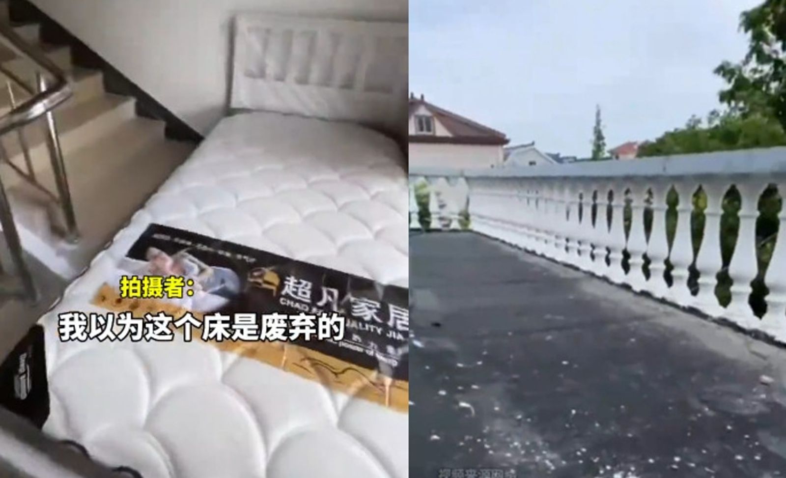 網紅將鐵門一拉開,映入眼簾的便是一段向上的階梯,爬上樓梯後,上面僅僅擺放了一張睡床,再拾級而上則勉強可見書桌和衣櫃等簡易傢俱,而向外增建的部分,則設置了盥洗設備,更令人意想不到的是,側邊的窗戶一打開,竟然連接一個私人露臺。