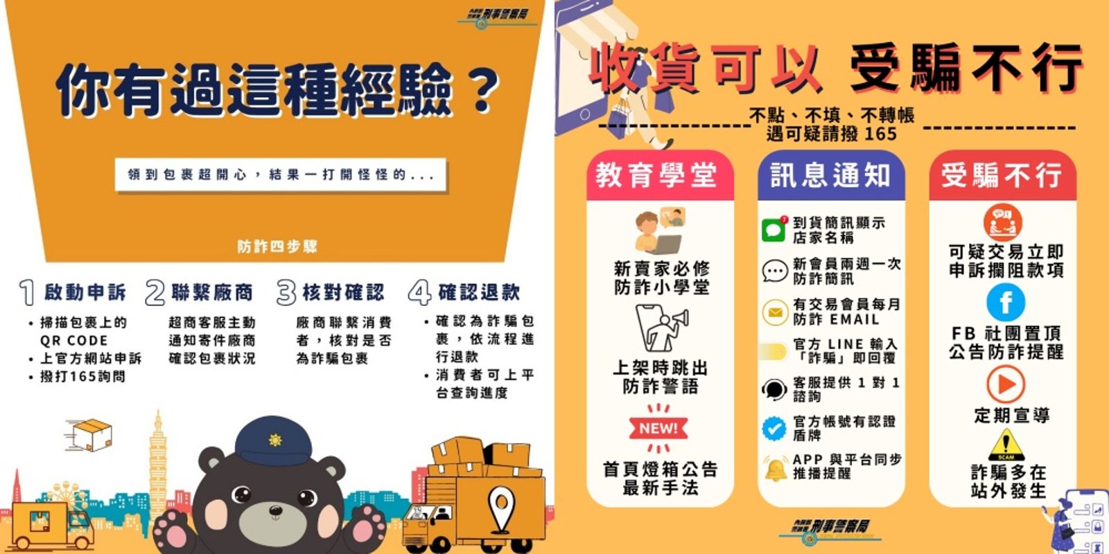 刑事局提醒民眾,詐騙包裹多由國內外不明賣家透過境外電商或社群平台接單,再委託貨運報關與物流配送,消費者取貨開箱後始發現受騙,在網購或取貨前,留意以下3點能有效降低受騙機率: