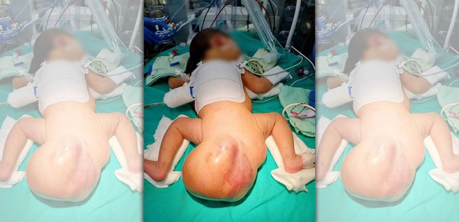 孕婦在懷孕25週時前往小兒外科諮詢,醫師建議待胎兒出生後再以核磁共振(MRI)鑑別診斷並規劃治療。孕婦於第33週順利產下3440公克的女嬰,但腫瘤已長至16.5×10×8公分,外觀極為明顯。