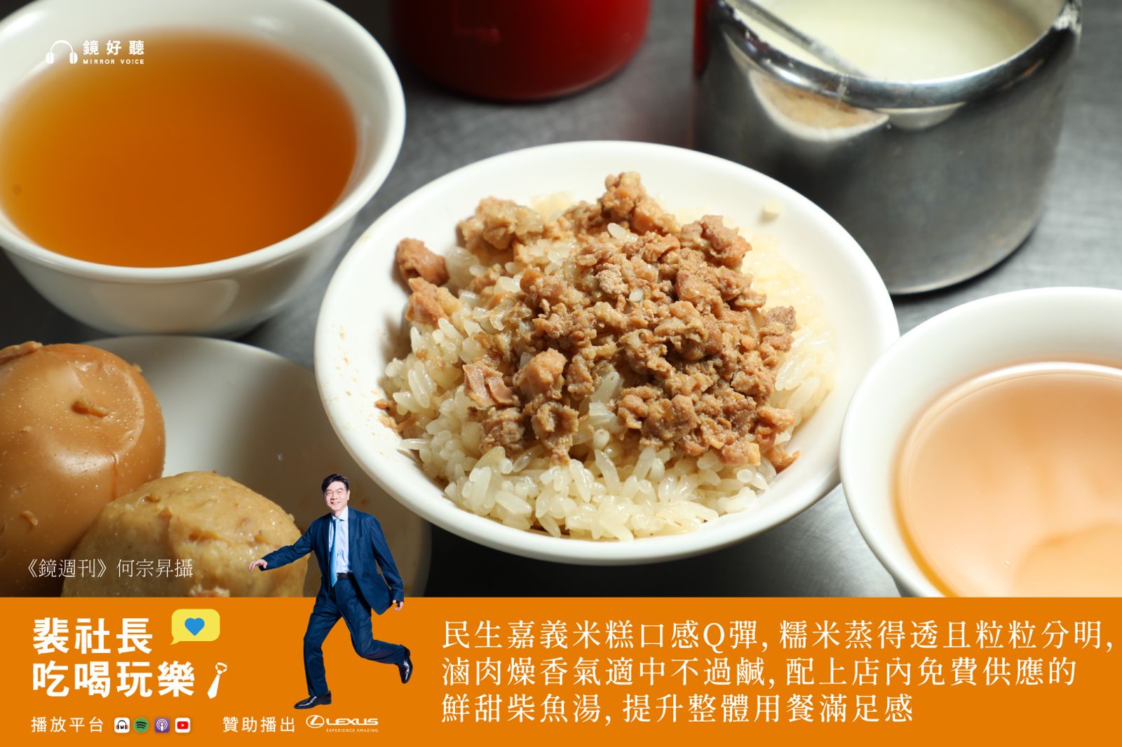 裴社長前去經營超過40年的「民生嘉義米糕」。他指出,台中米糕與台南的風格迥異,通常會捨棄魚鬆與小黃瓜,而是用糯米與肉燥呈現米糕本身的香甜。店家選用彰化溪湖長糯米,粒粒分明又透亮,淋上豬後腿肉製成的清爽肉燥。裴社長誇讚:「米糕口感Q彈,滷肉燥香氣適中不過鹹。」隨餐附贈的厚切柴魚熬煮的鮮甜清湯也相當美味。