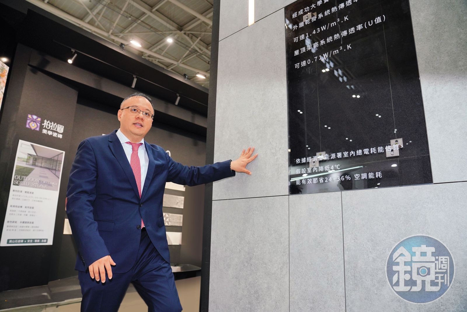 林祐宇表示,過去建築物施工過程中,可能有8到12%不等的磁磚損耗、大部分變成事業廢棄物,所以他們跟遠雄合作,把廢棄磁磚重新做成原料、再投入再生綠建材的製程,取得再生綠建材標章。「磁磚用幾十年都不會壞,而且好清潔、好保養,是很環保的建材。」林祐宇講起磁磚就是眉飛色舞。